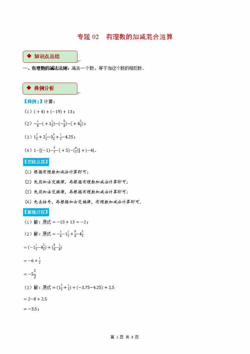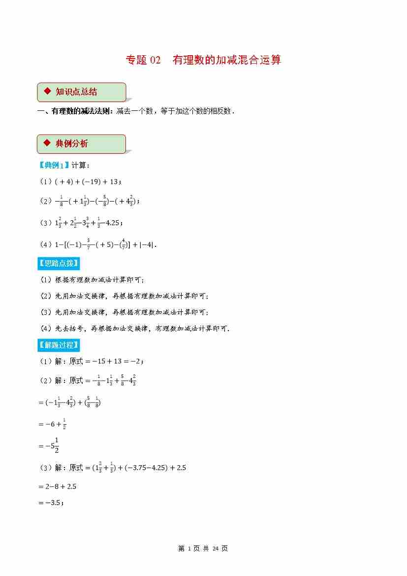 专题02 有理数的加减混合运算(计算题专项训练)(浙教版2024)(解析版)