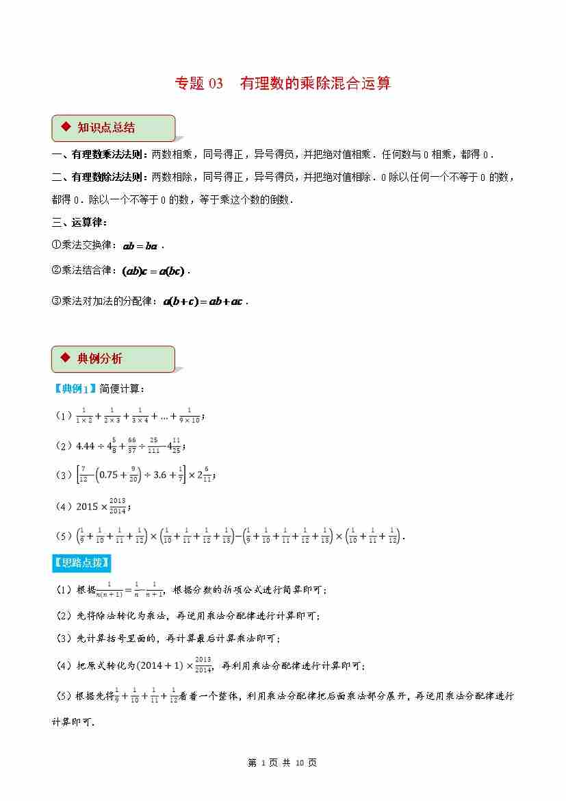 专题03 有理数的乘除混合运算(计算题专项训练)(浙教版2024)(原卷版)