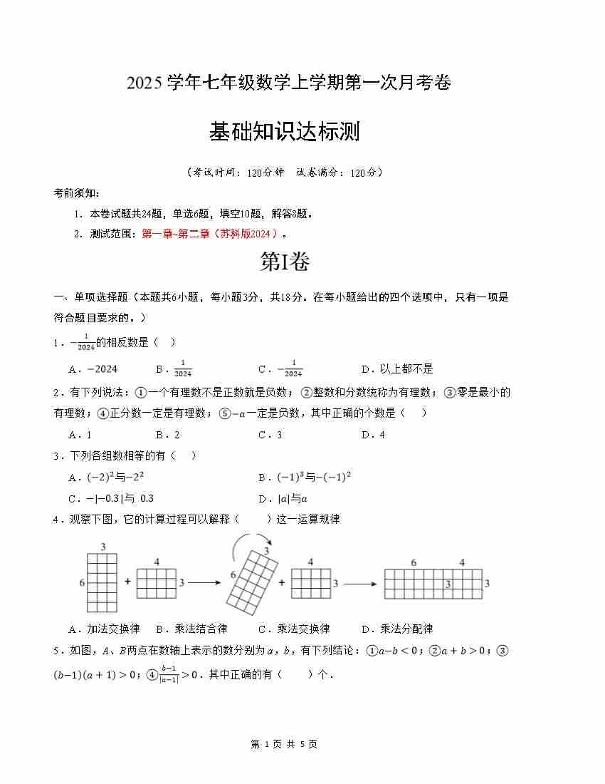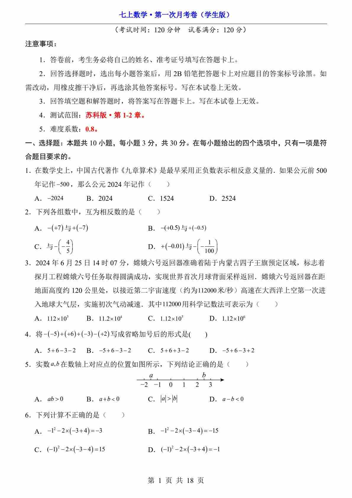 七年级数学第一次月考卷(苏科版2024)(考试版)【测试范围:第一章~第二章】