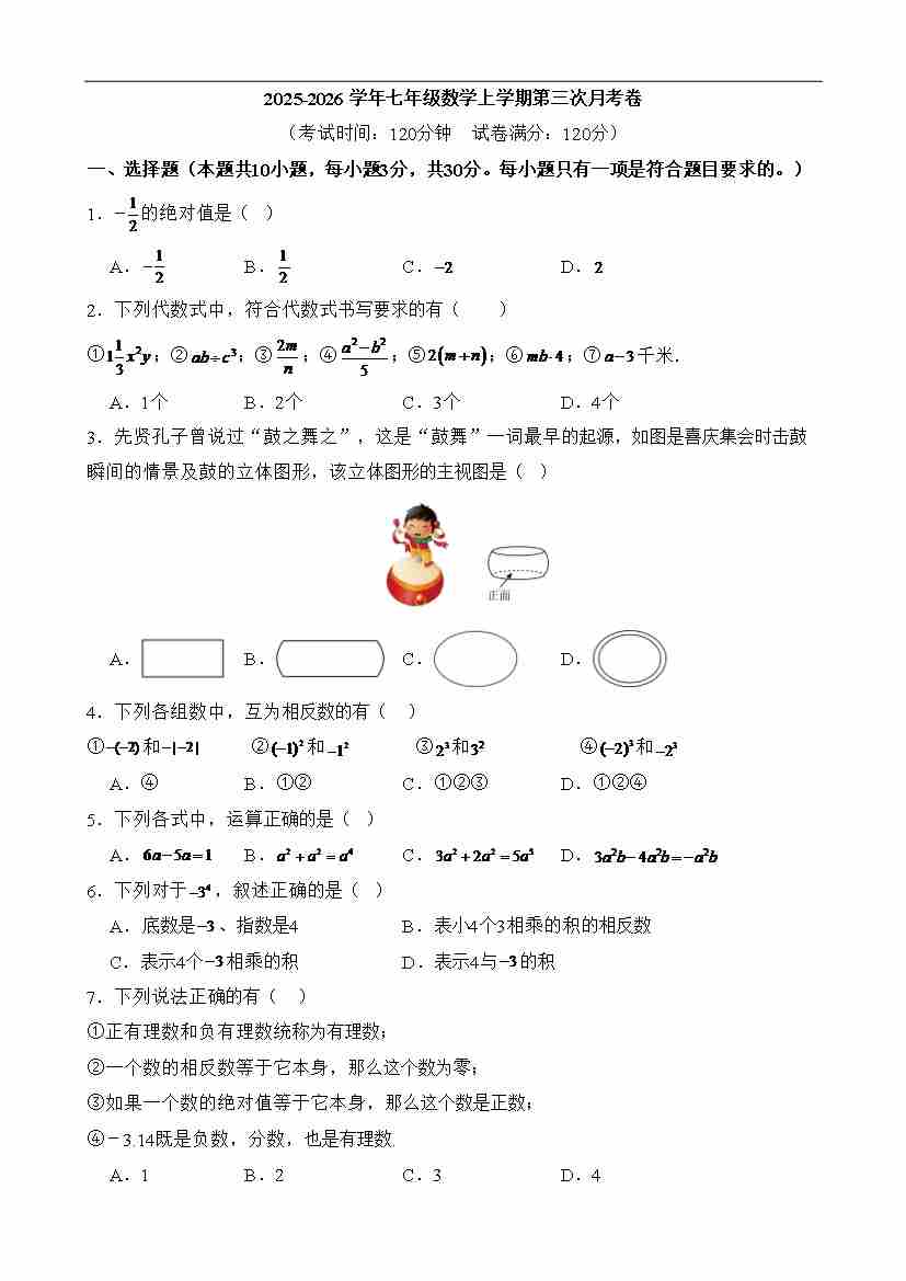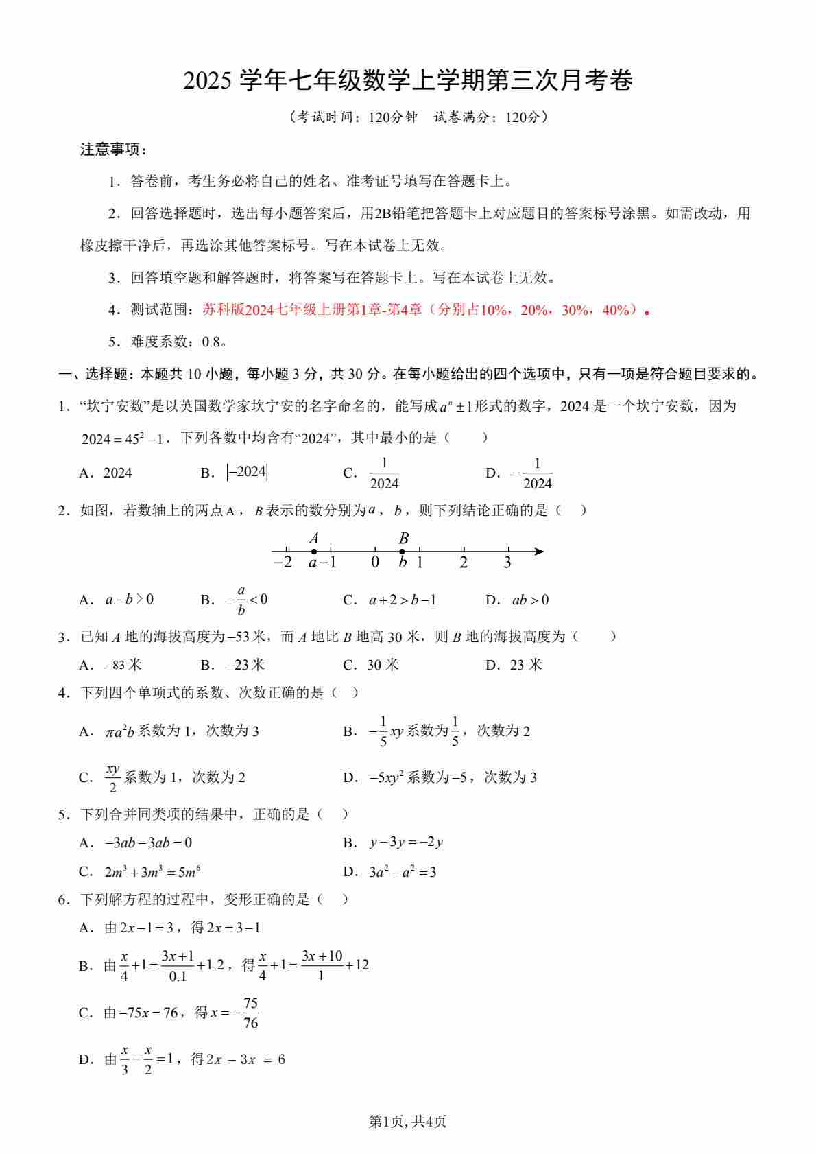 七年级苏科数学第三次月考卷(考试版)【测试范围:七上第1章-第4章】