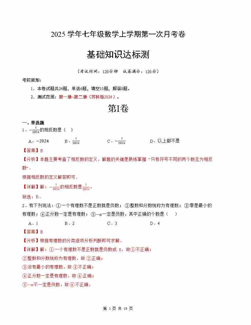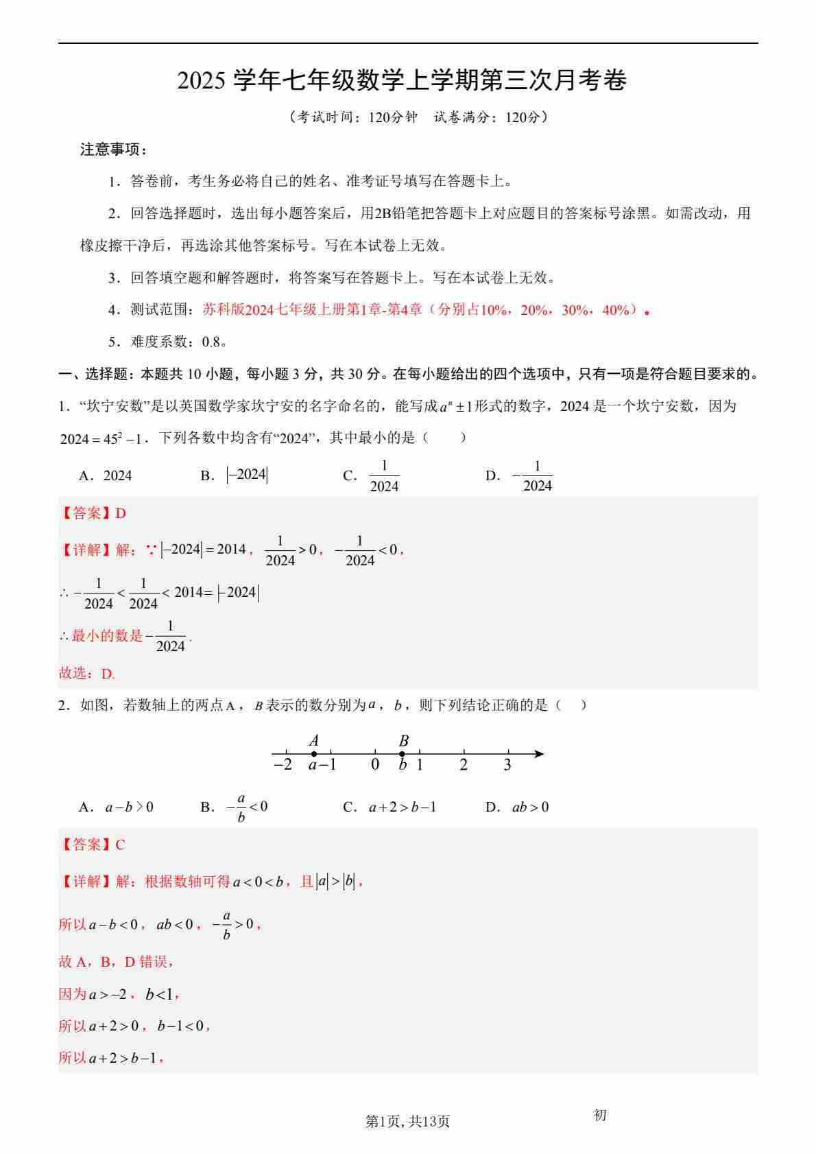 七年级数学第一次月考卷(苏科版2024)(解析版)【测试范围:第一章~第二章】