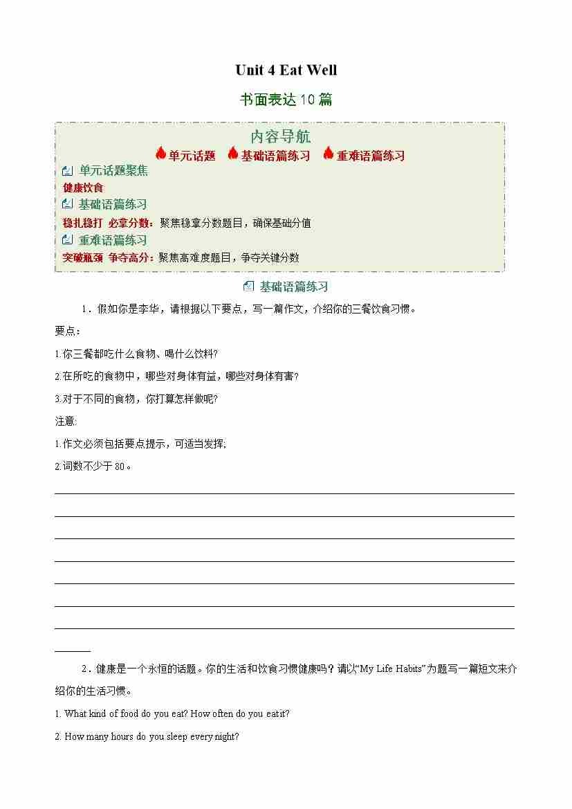 Unit 4 Eat Well 书面表达10篇(单元话题:健康饮食)(原卷版)