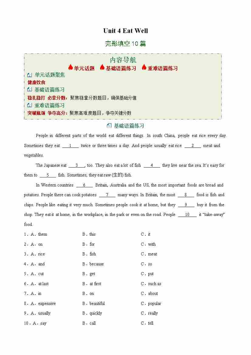 Unit 4 Eat Well 完形填空10篇(单元话题:健康饮食)(解析版)