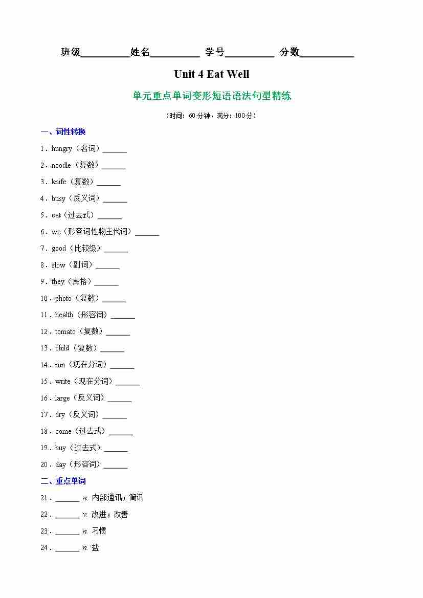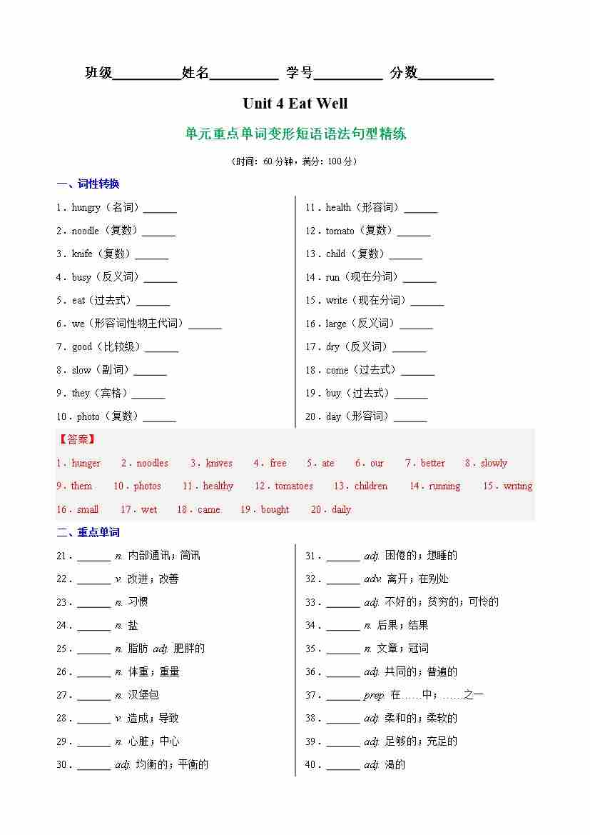 Unit 4 Eat Well 核心单词,词性转换,短语,语法,句型精练(原卷版)