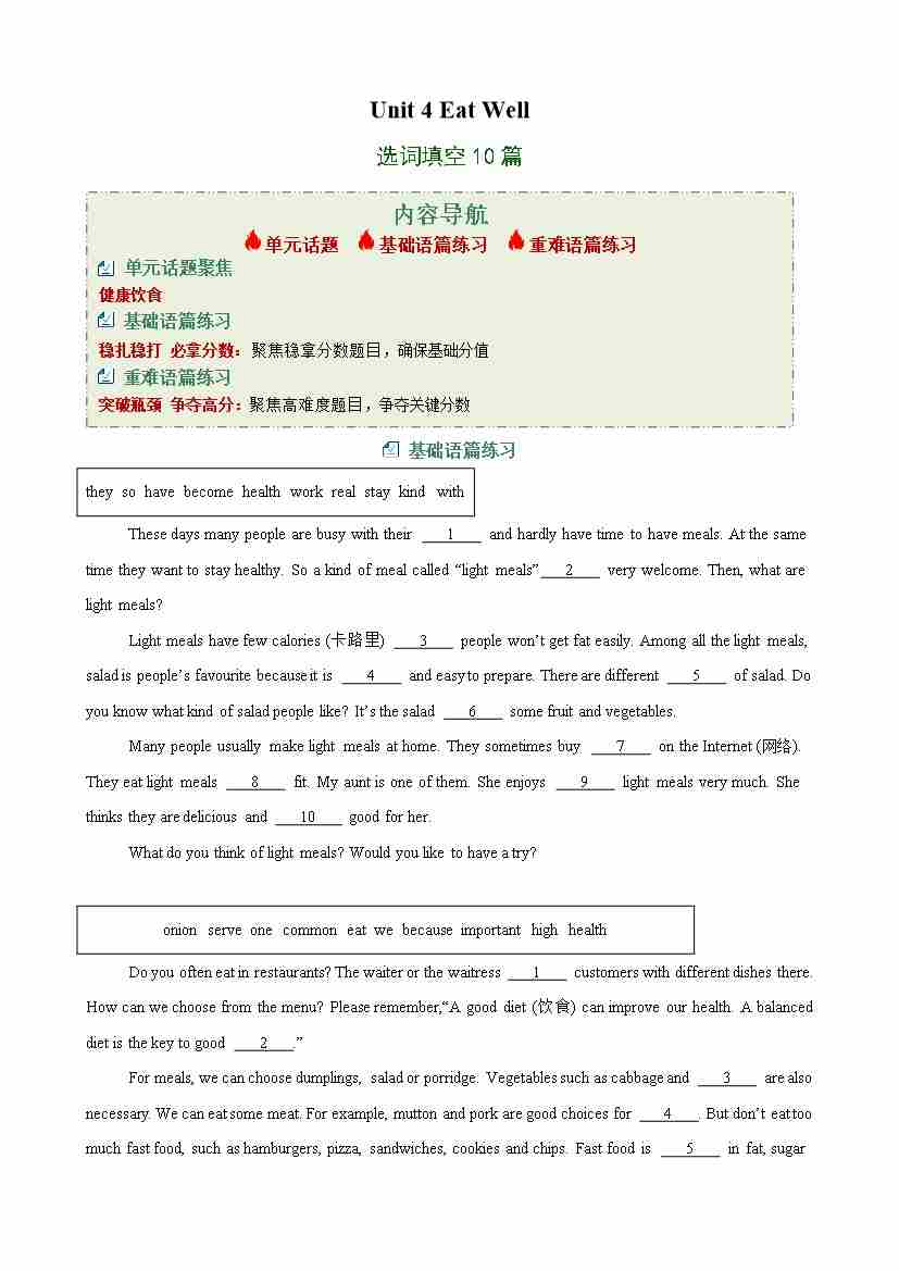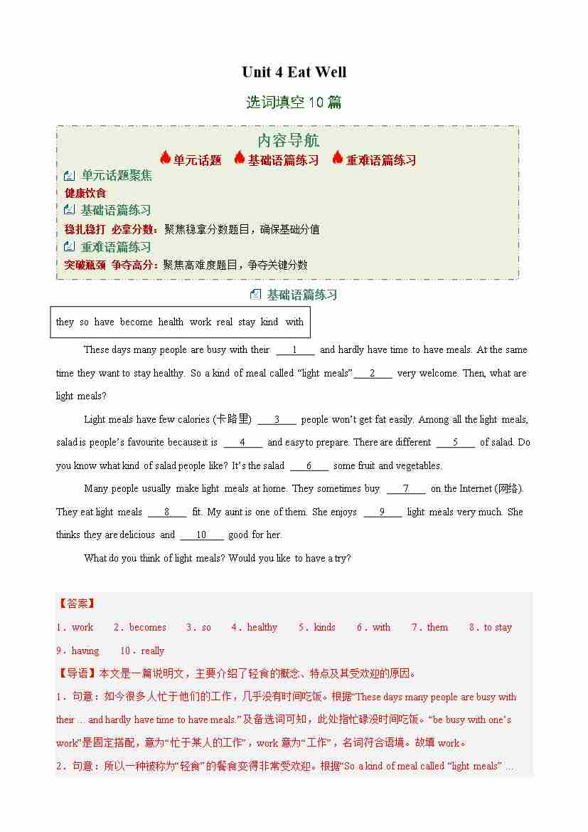 Unit 4 Eat Well 短文选词填空10篇(单元话题:健康饮食)(解析版)