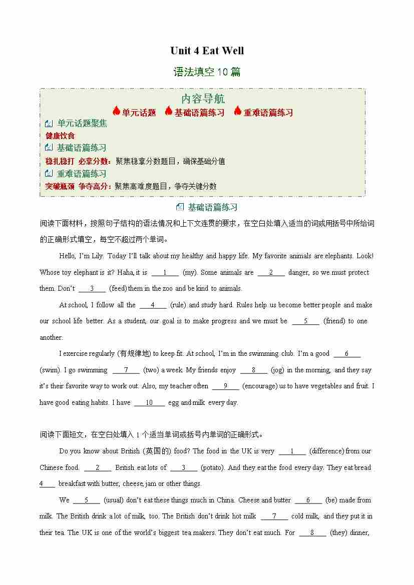 Unit 4 Eat Well 语法填空10篇(单元话题:健康饮食)(原卷版)