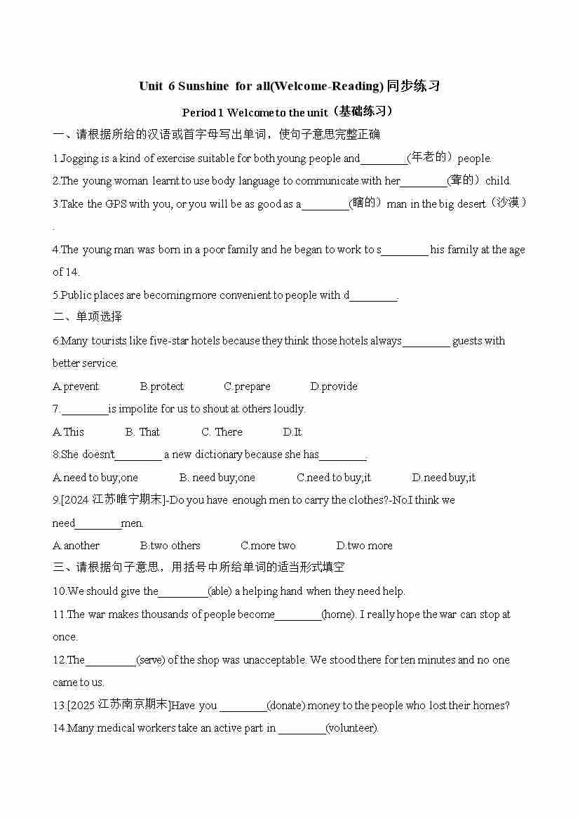 Unit6 Sunshine for all(Welcome-Reading)同步练习-2025-2026学年译林版英语八年级下册