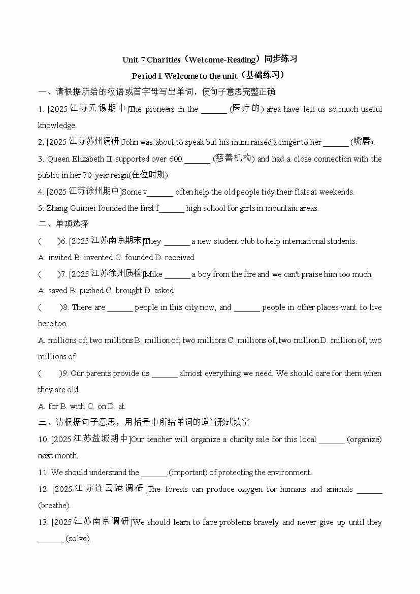 Unit7 Charities(Welcome-Reading)同步练习-2025-2026学年译林版英语八年级下册