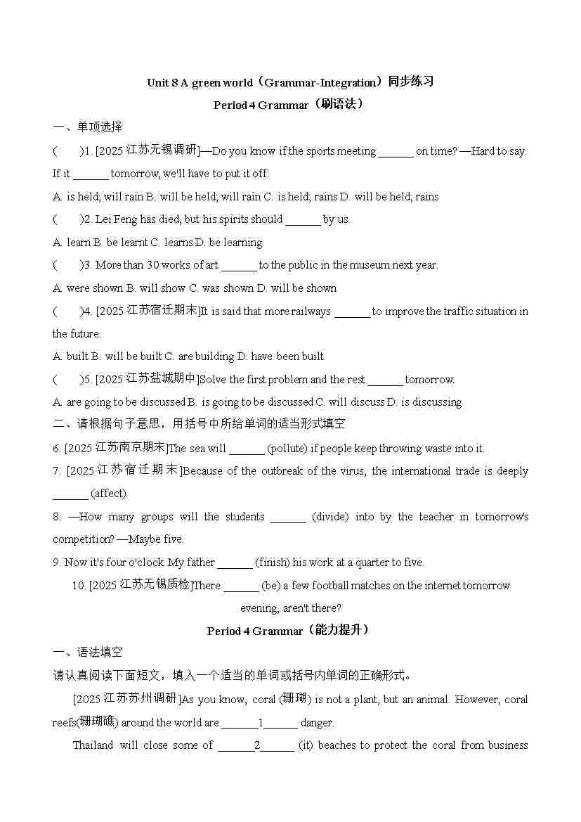 Unit8 A green world(Grammar-Integration)同步练习-2025-2026学年译林版英语八年级下册