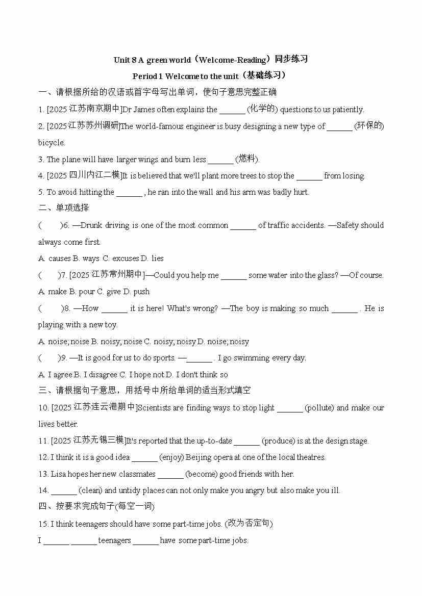 Unit8 A green world(Welcome-Reading)同步练习-2025-2026学年译林版英语八年级下册docx