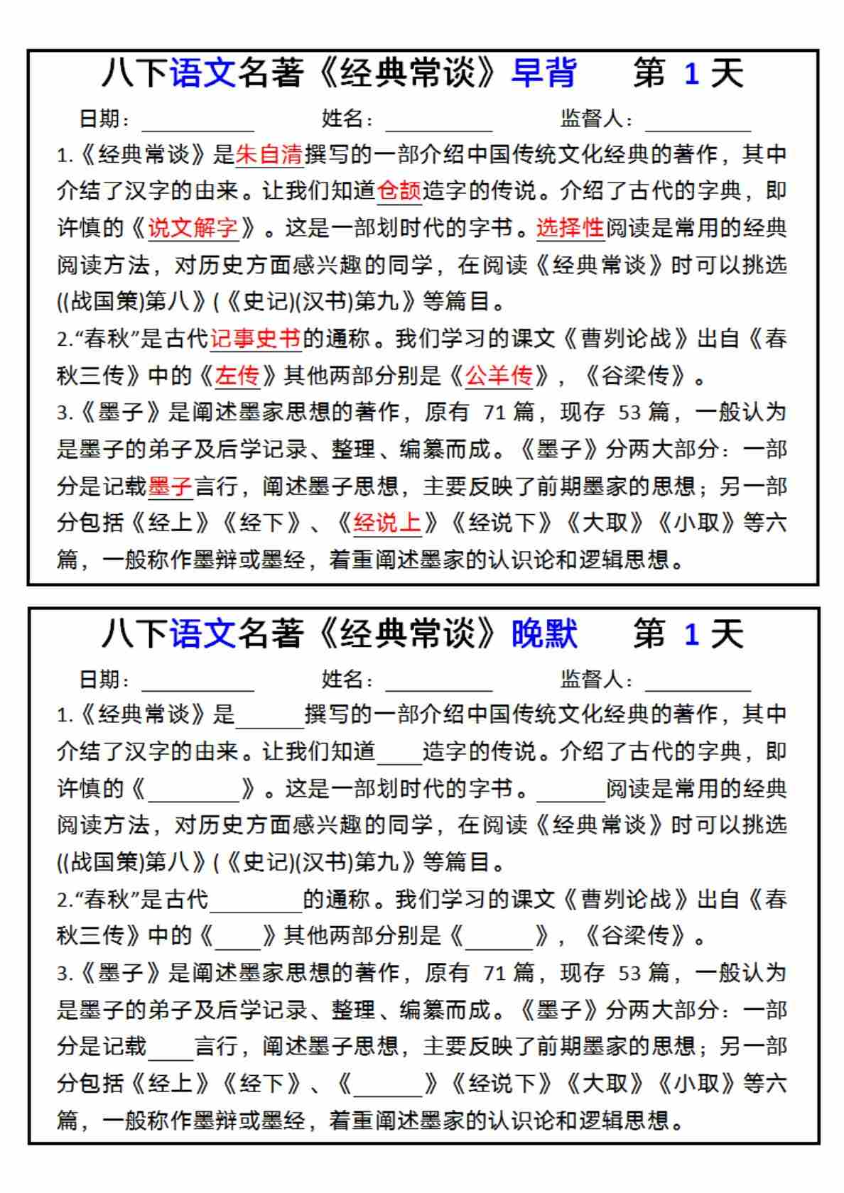 八下语文《经典常谈》早背晚默小纸条28天