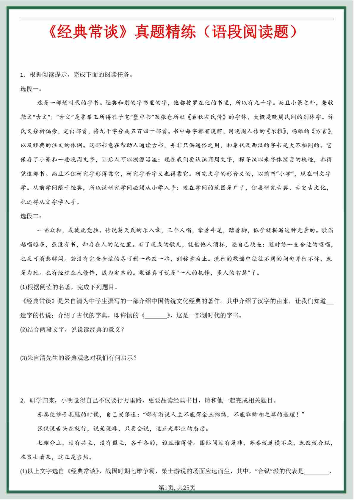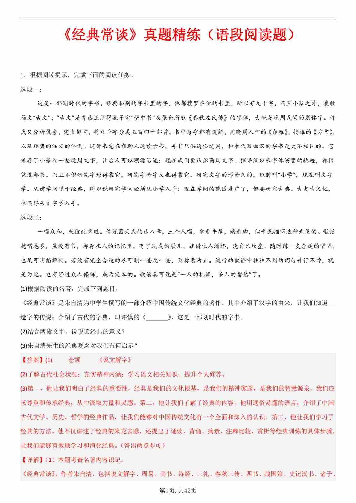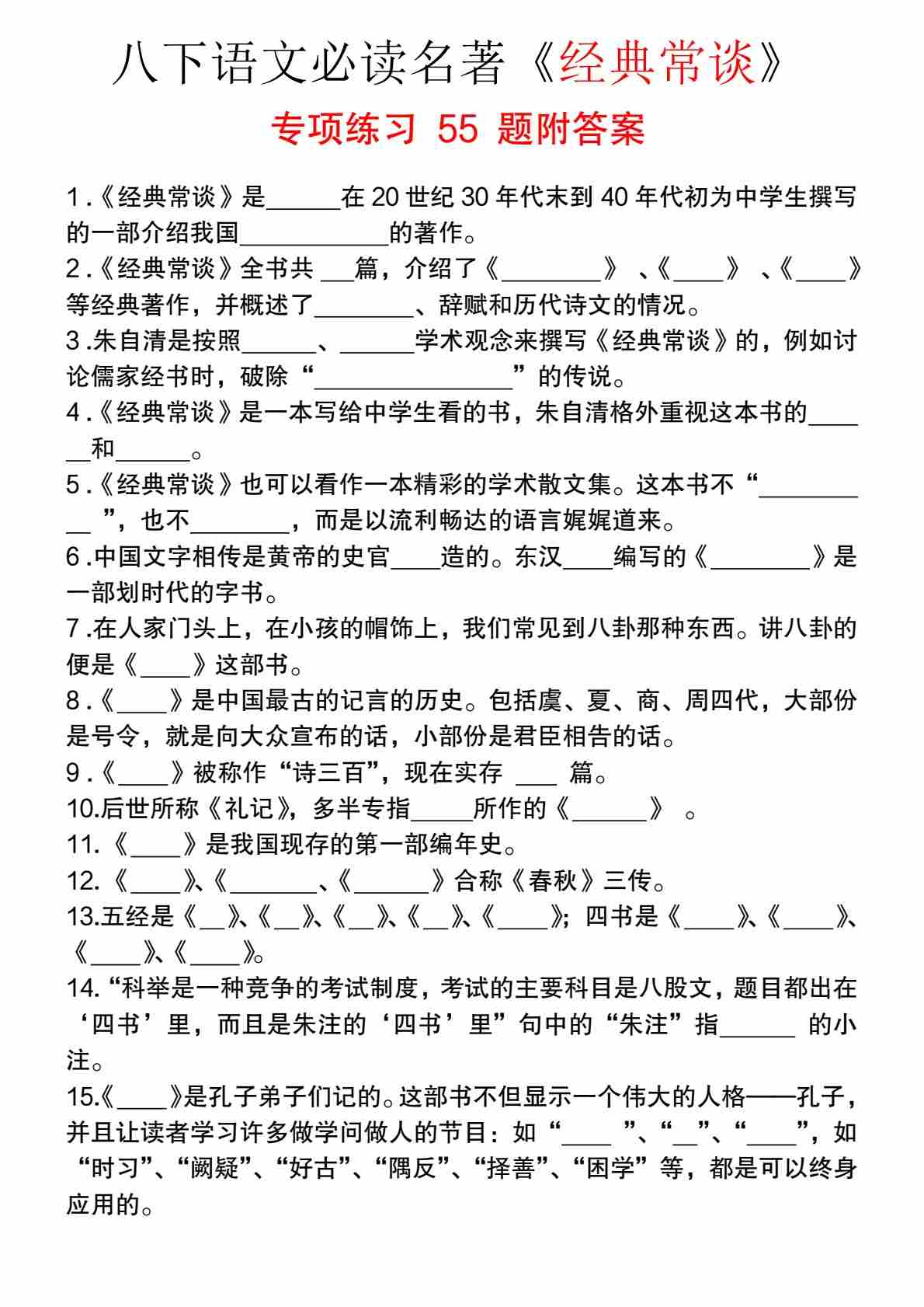 八下语文必读名著《经典常谈》专项练习55题_