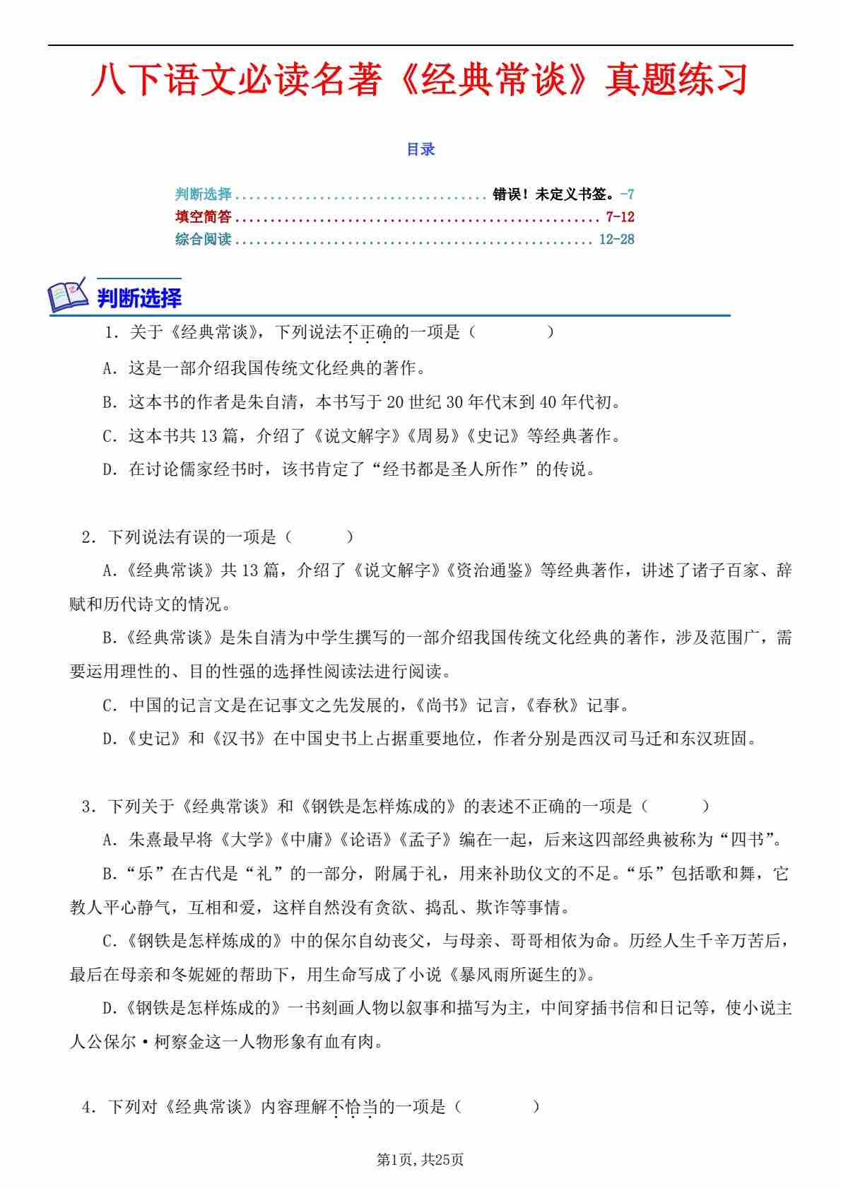 八下语文经典常谈--分层训练-原卷版