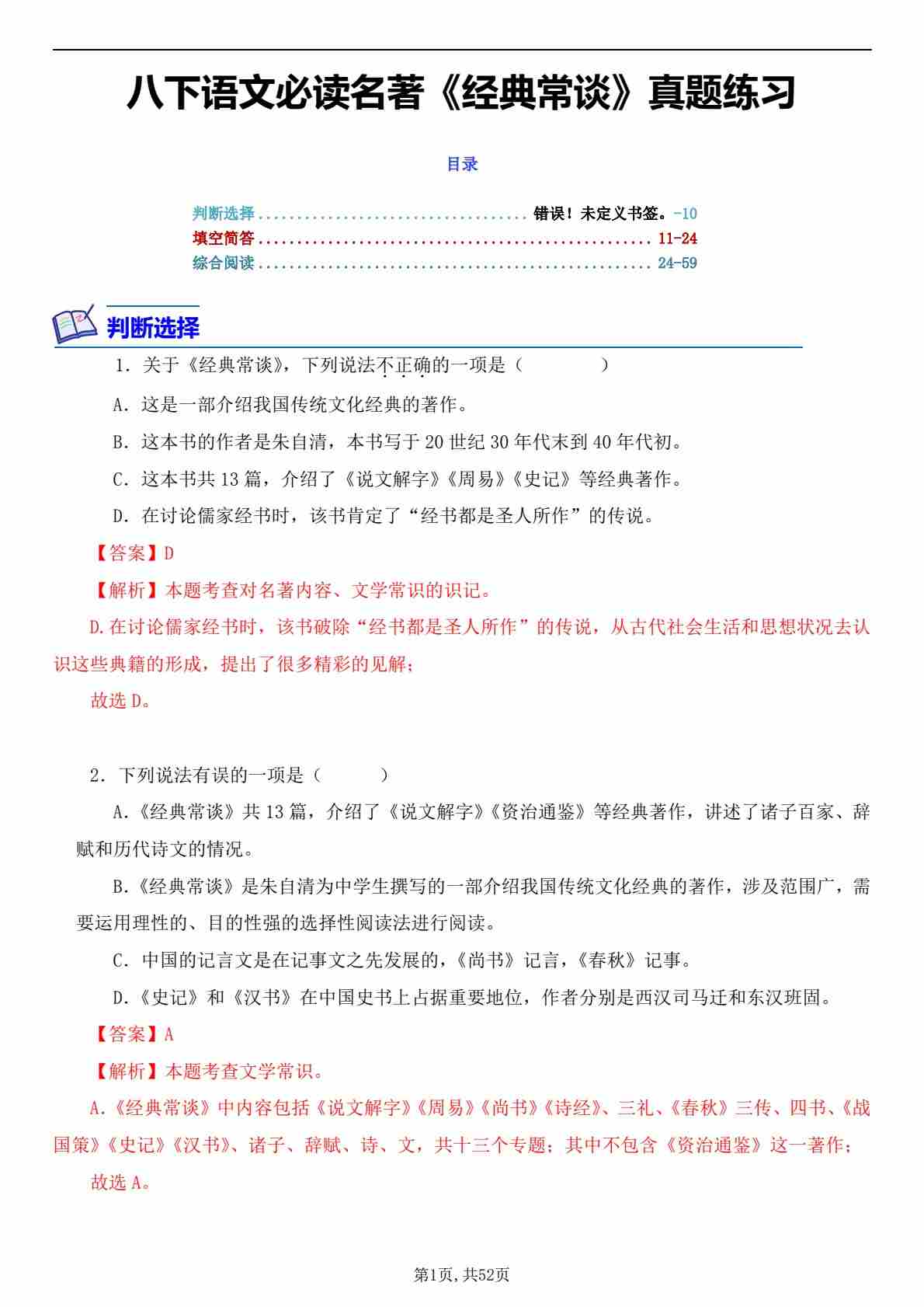 八下语文经典常谈--分层训练-解析版