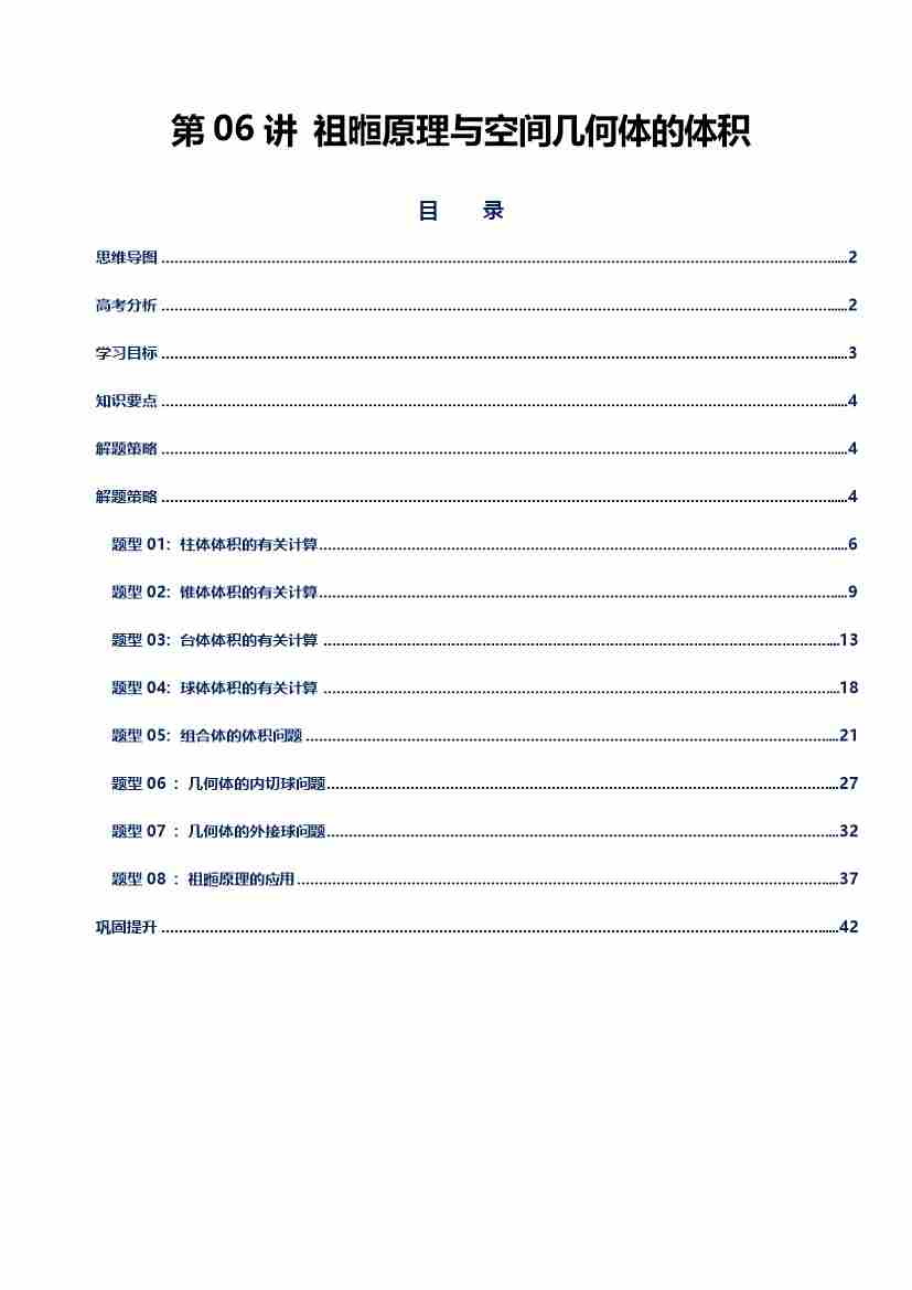 第06讲 祖暅原理与几何体体积讲义(思维导图、知识要点、解题技巧、题型归纳、巩固提升)(新高考通用)-学生版