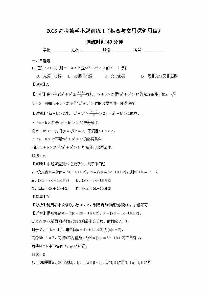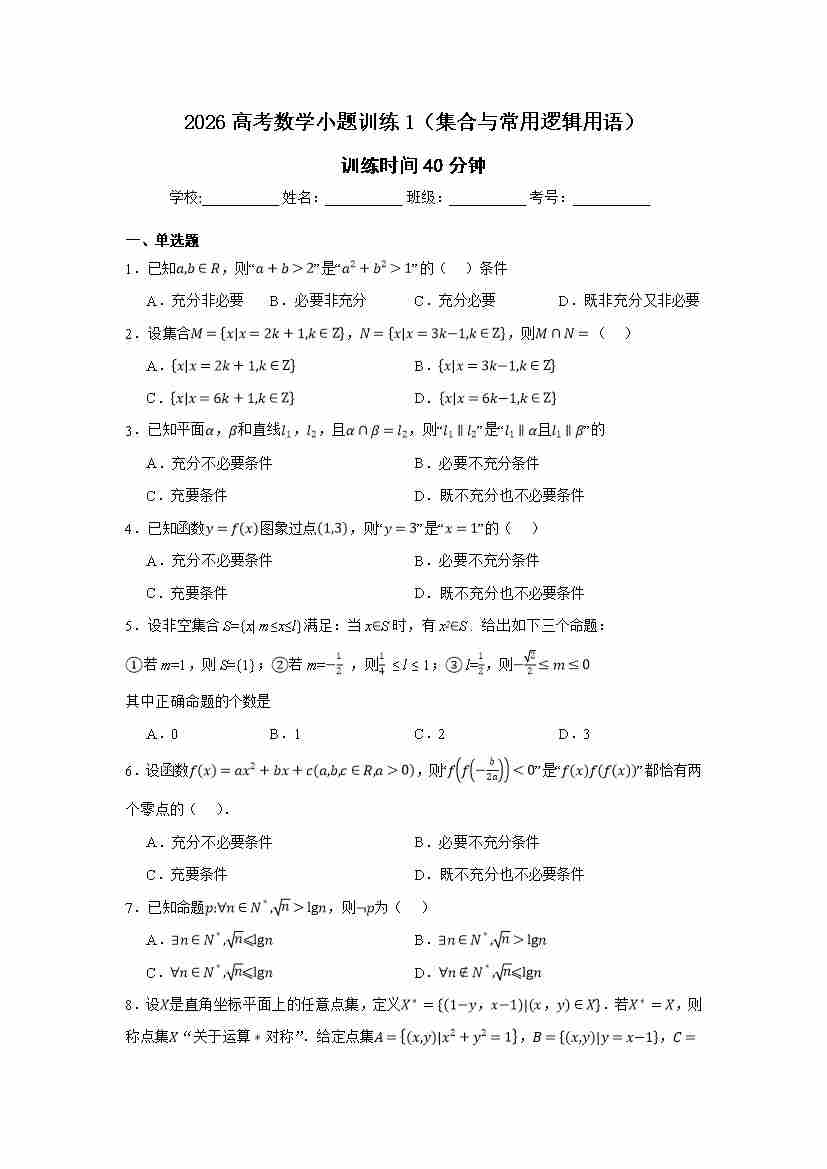 高考数学小题训练1(集合与常用逻辑用语)学生版