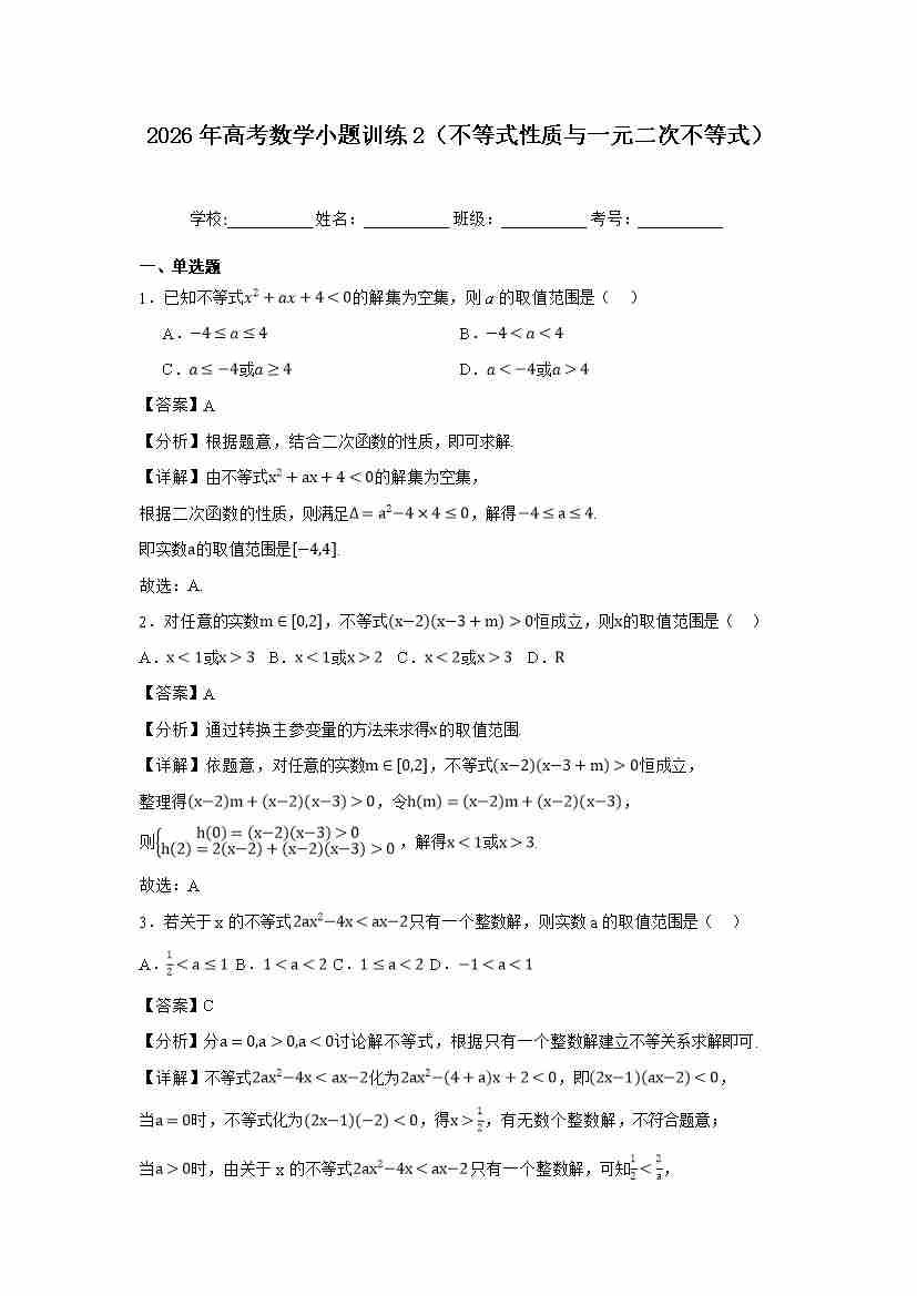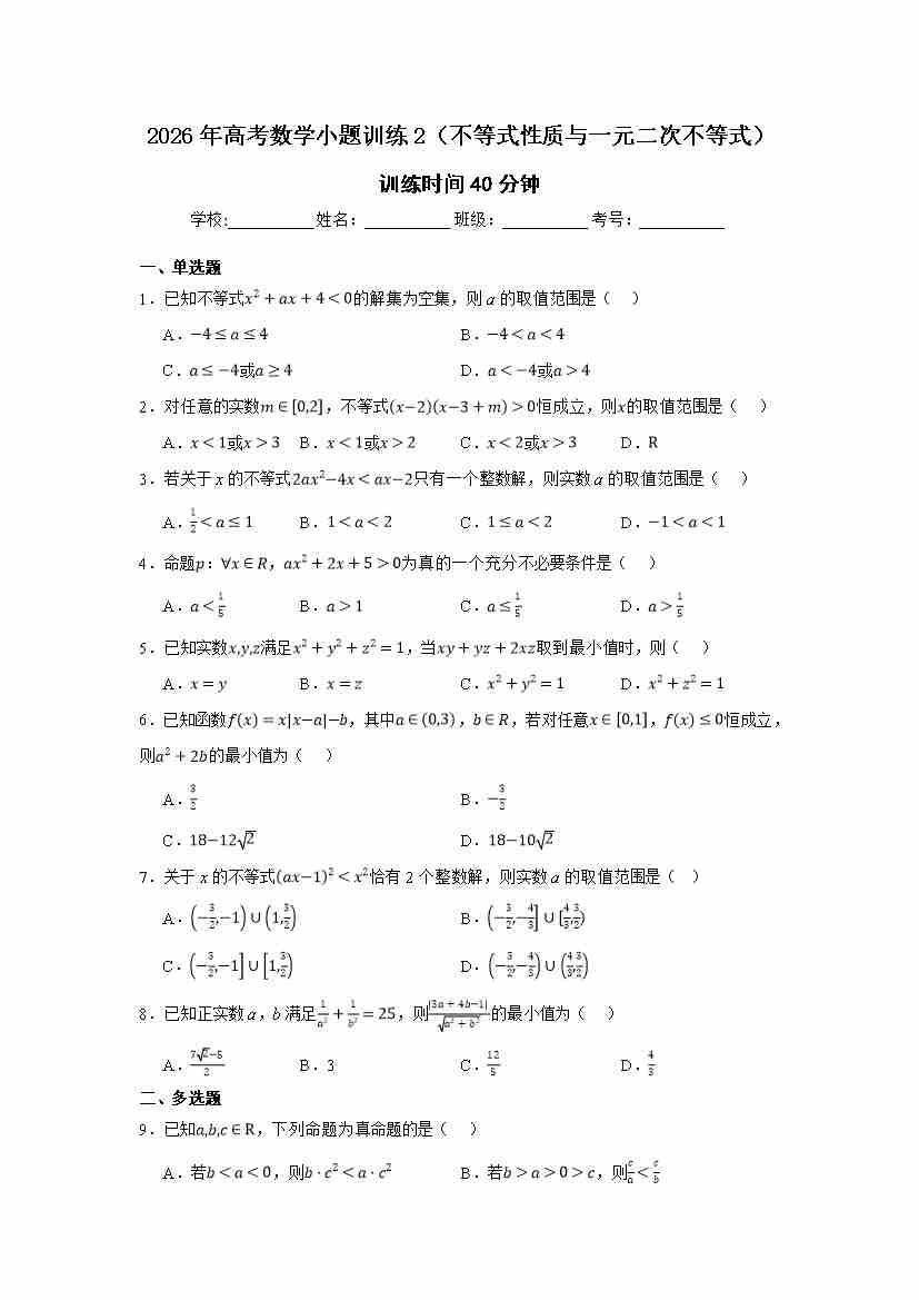 高考数学小题训练2(不等式性质与一元二次不等式)学生版