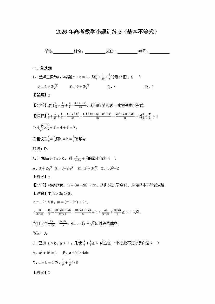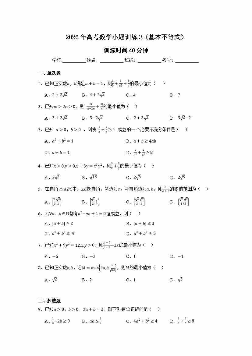 高考数学小题训练3(基本不等式)学生版