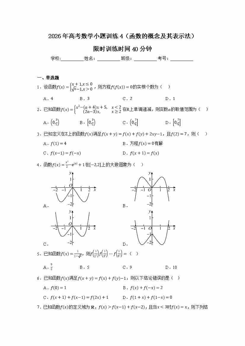 高考数学小题训练4(函数的概念及其表示法)学生版
