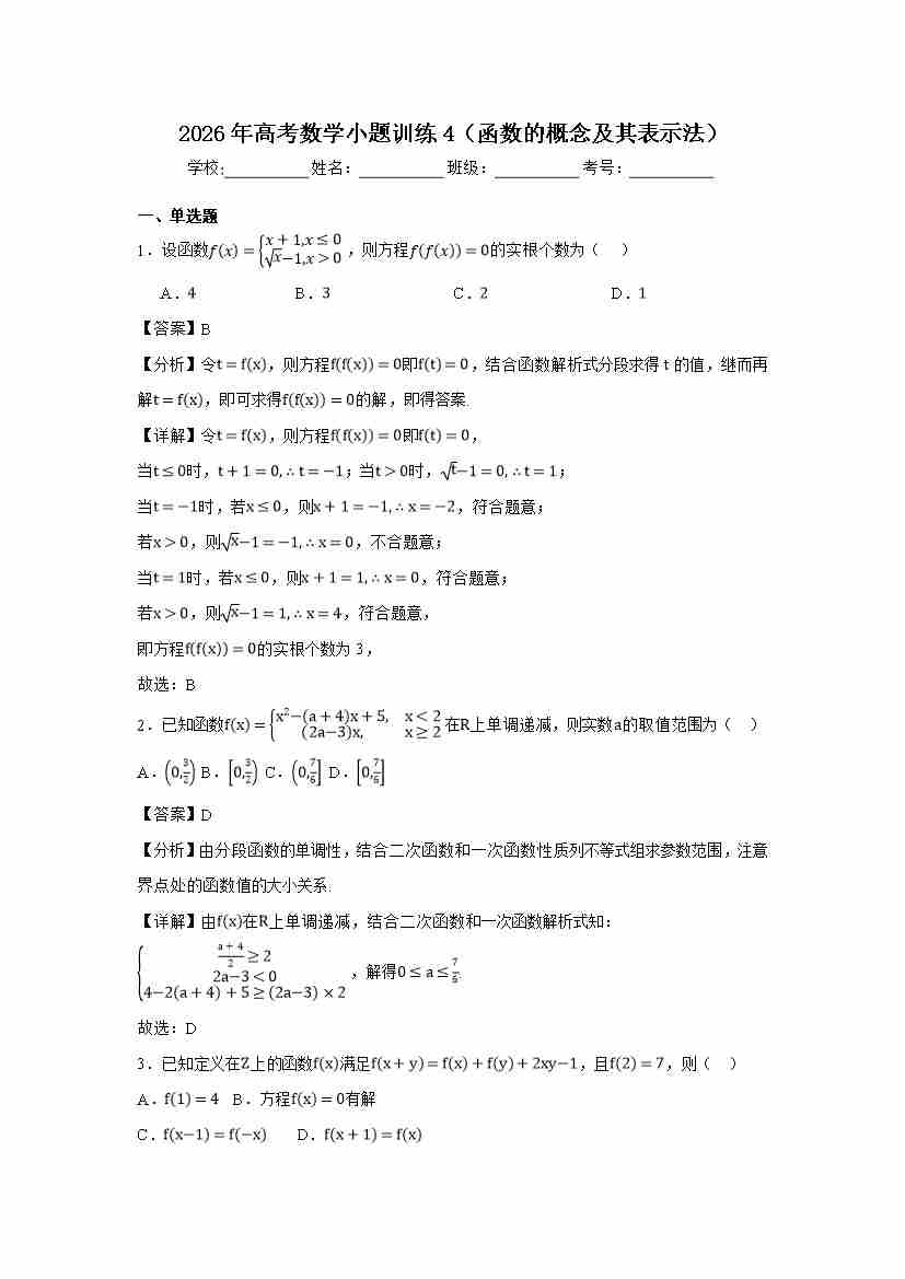 高考数学小题训练4(函数的概念及其表示法)教师版