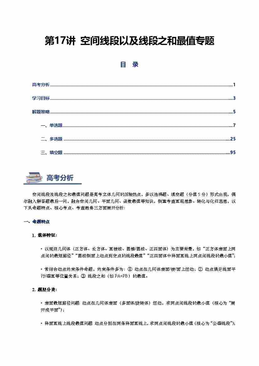 第17讲 空间线段以及线段之和最值问题(新高考通用)-教师版