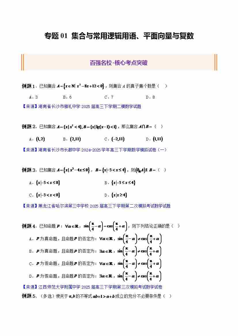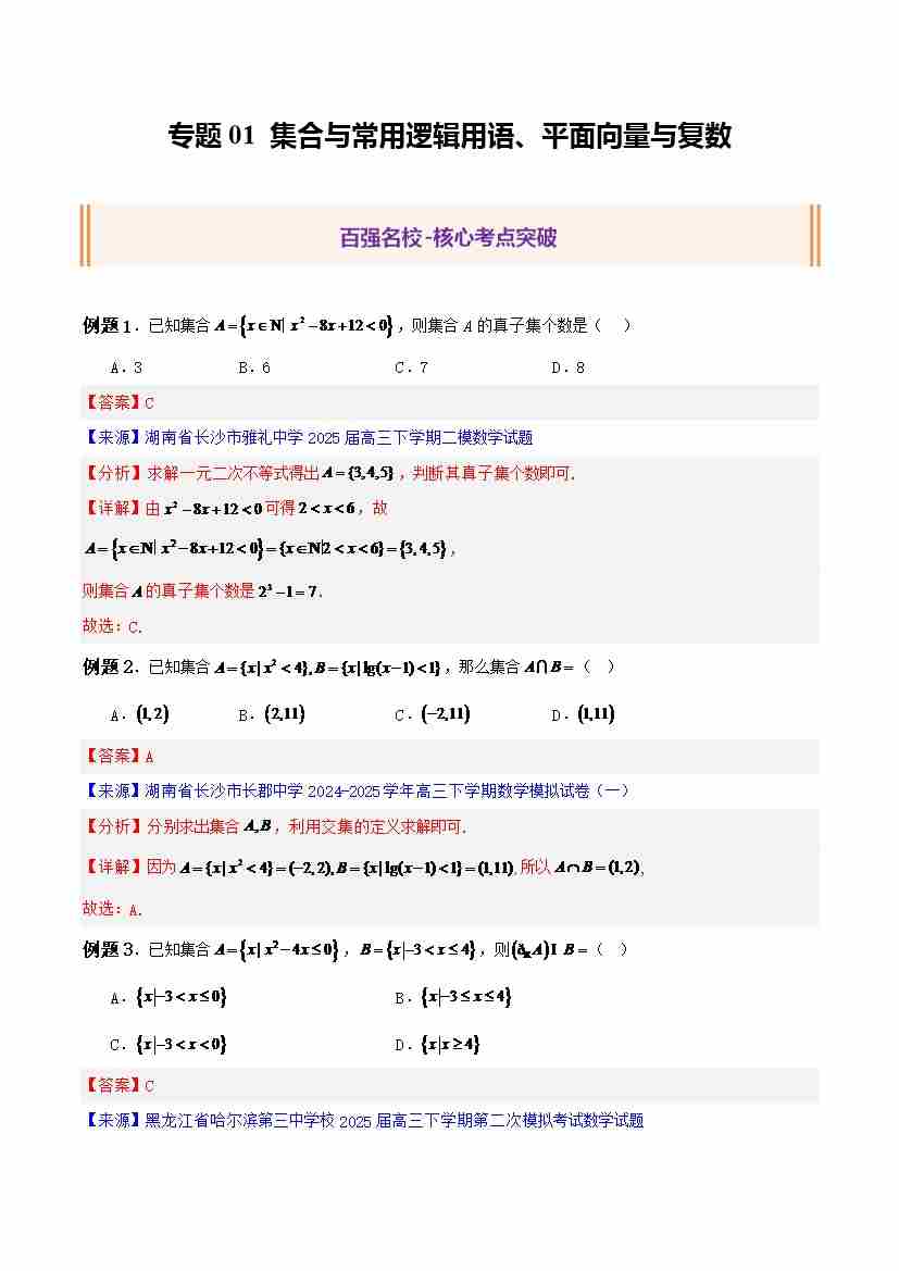 专题01 集合与常用逻辑用语、平面向量与复数(精选53题)(学生版)