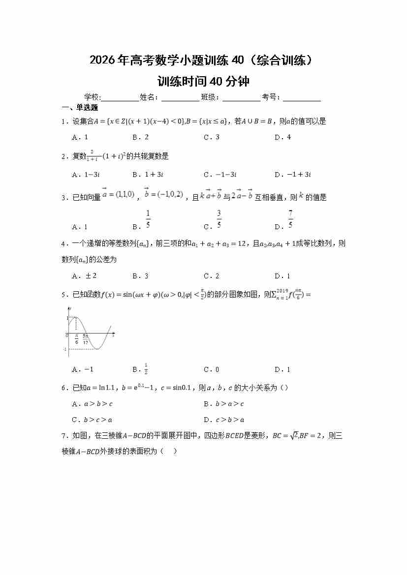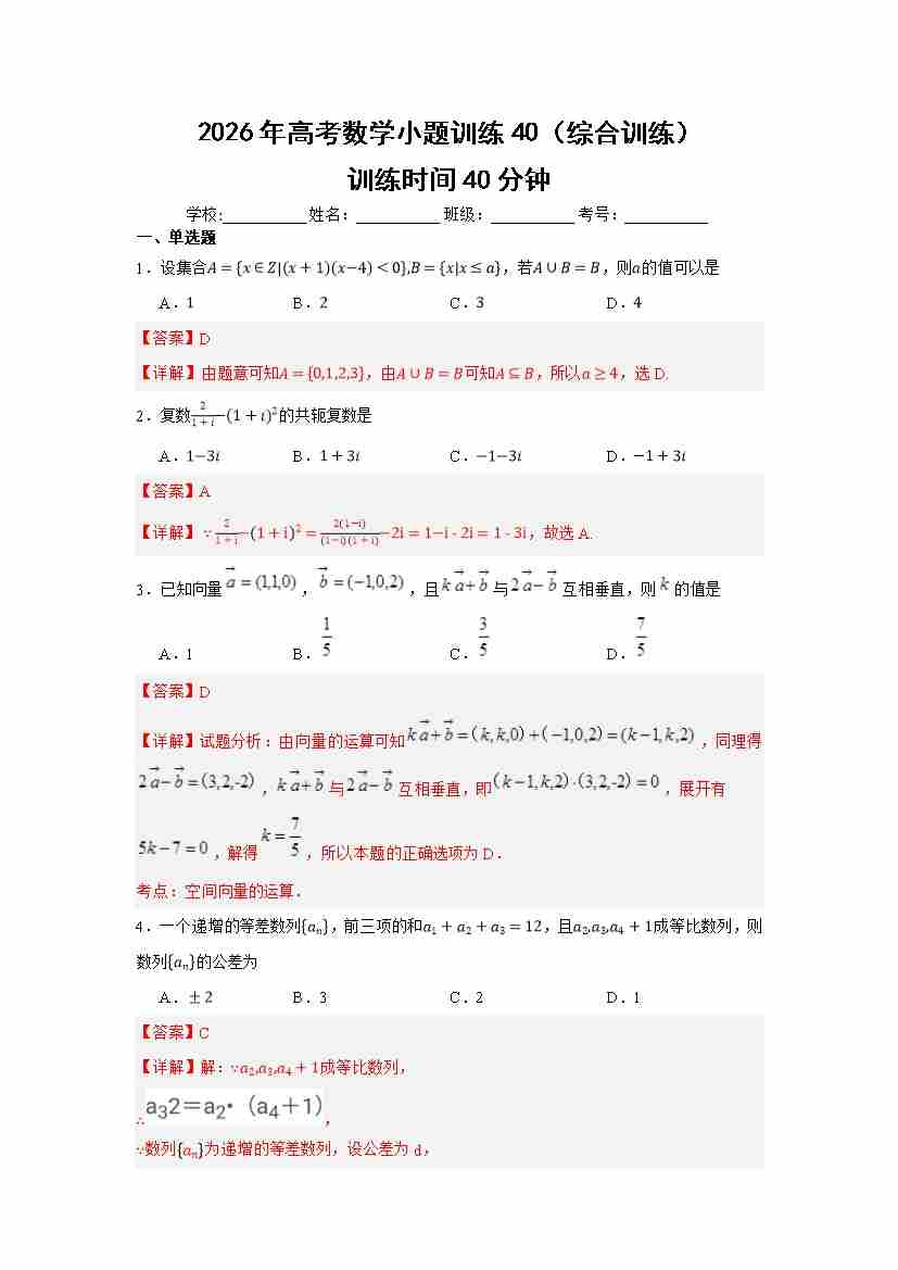 高考数学小题训练40(综合训练)学生版