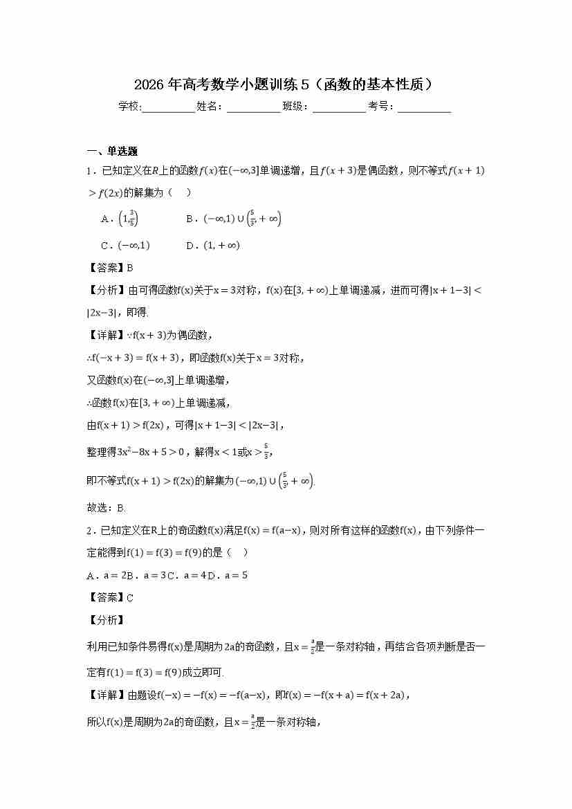 高考数学小题训练5(函数的基本性质)教师版