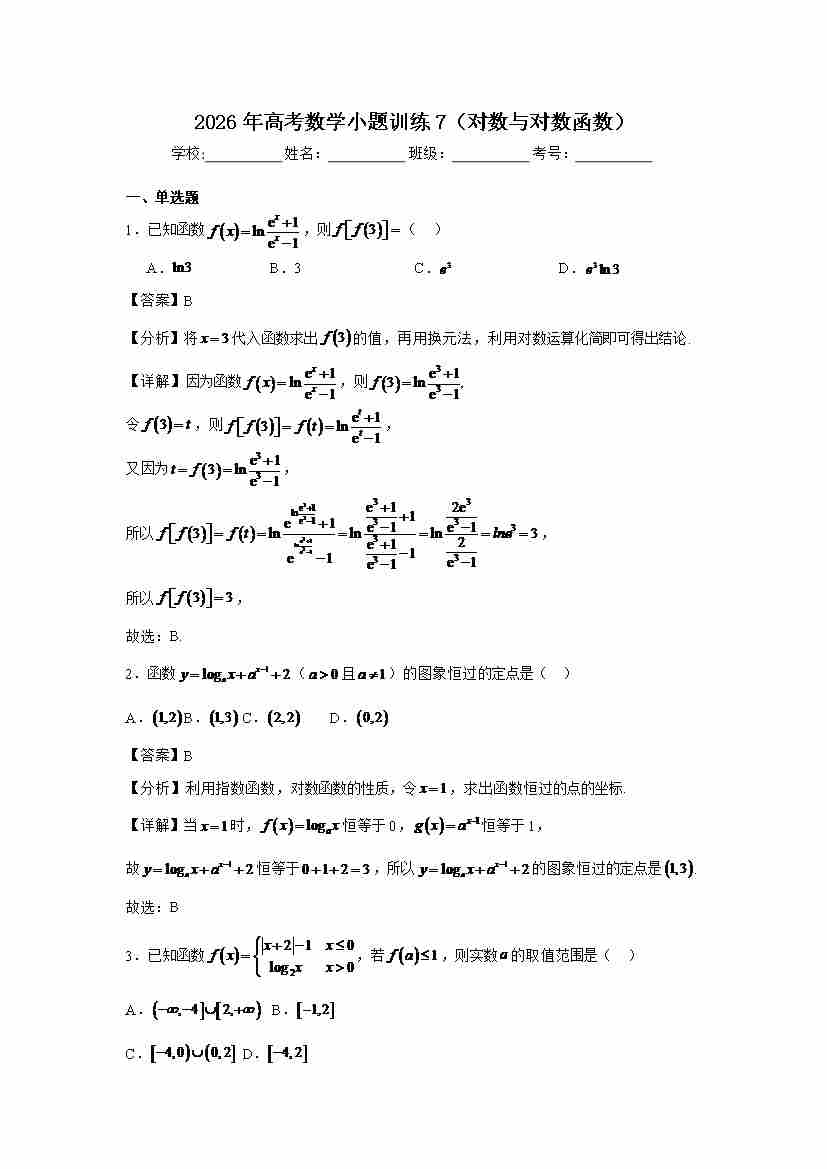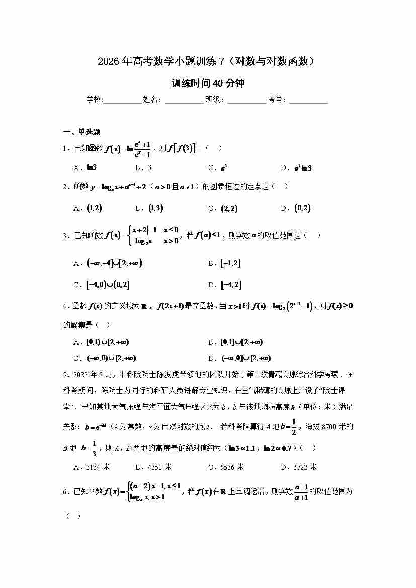 高考数学小题训练7(对数与对数函数)学生版