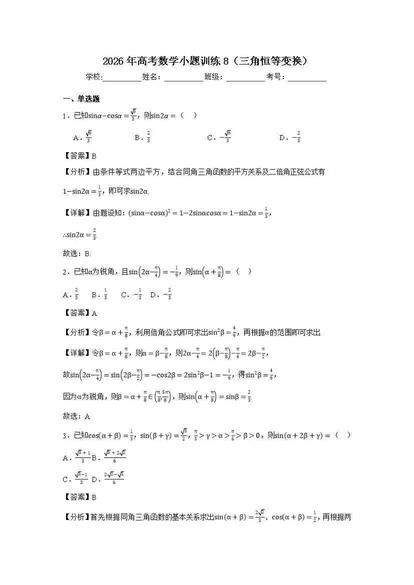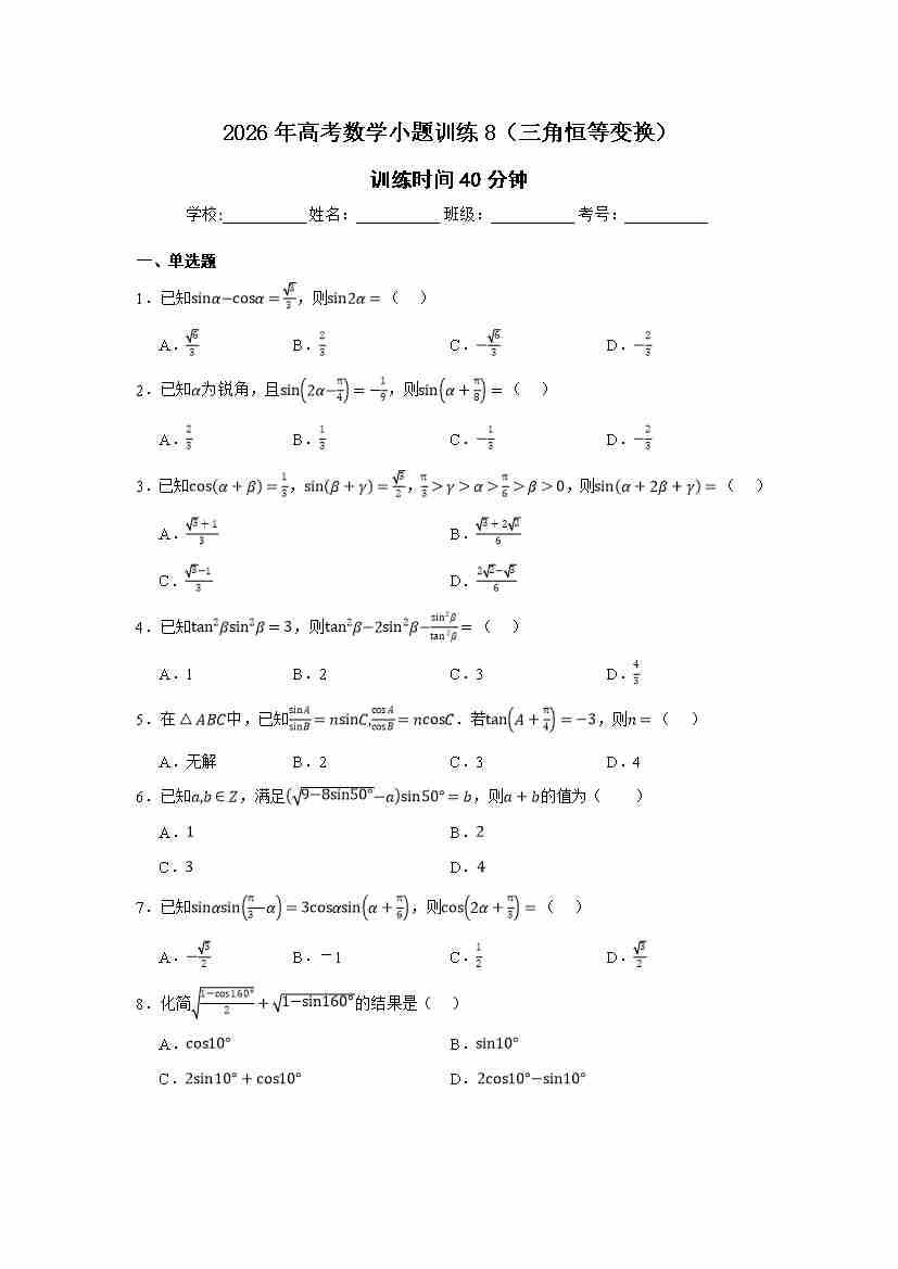 高考数学小题训练8(三角恒等变换)学生版