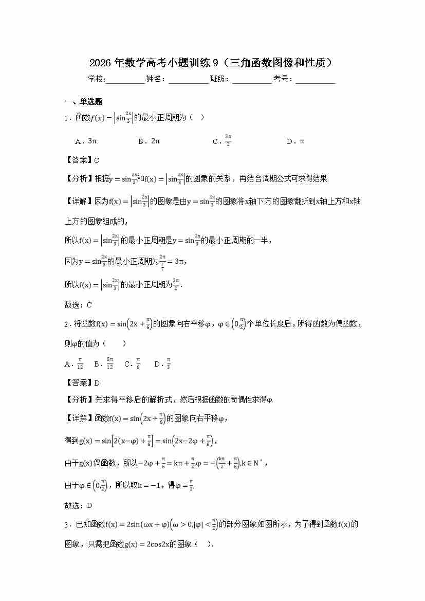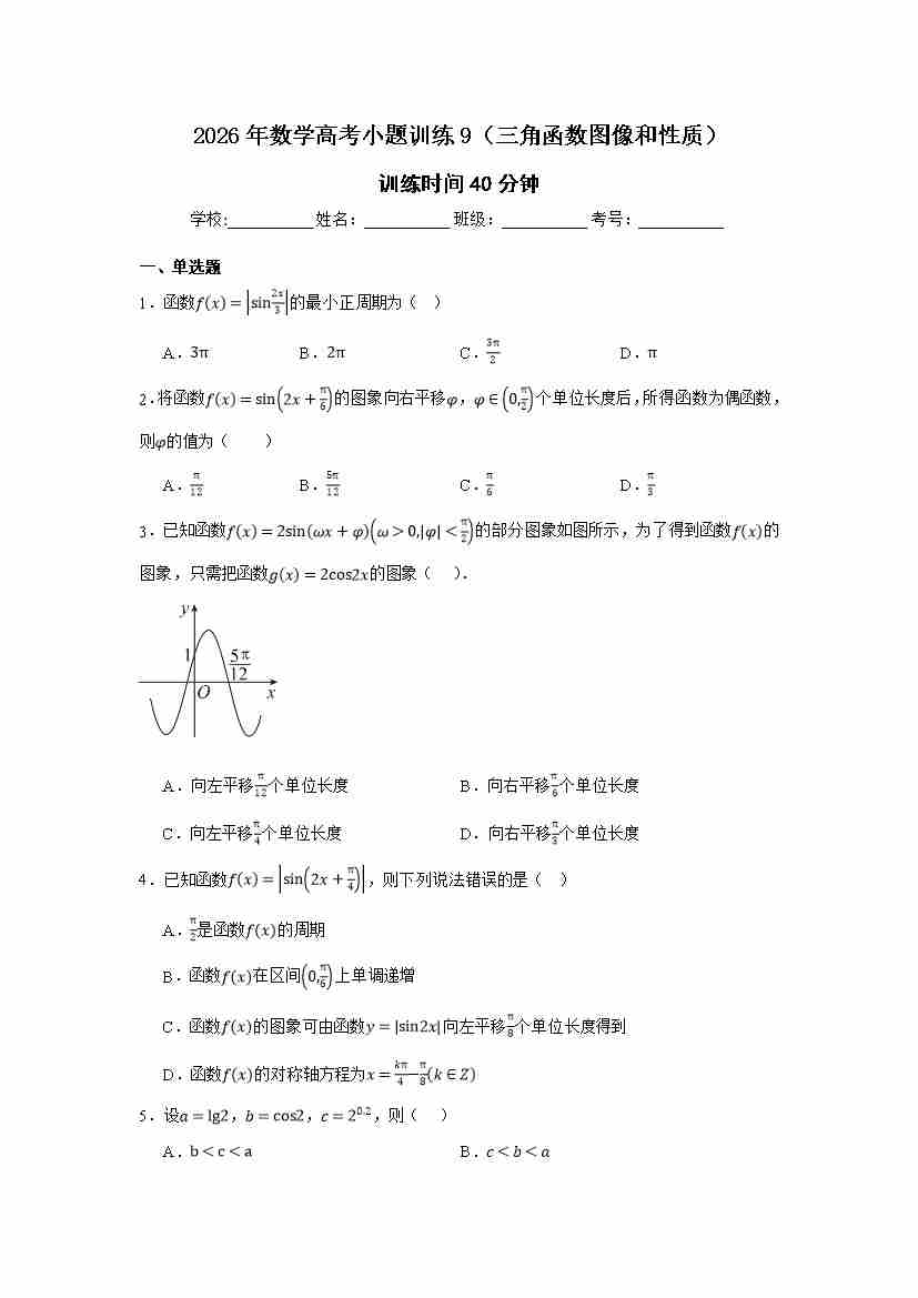 高考数学小题训练9(三角函数图像和性质)学生版