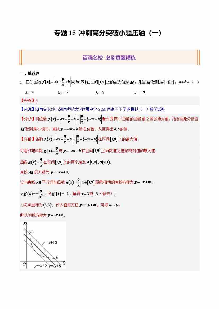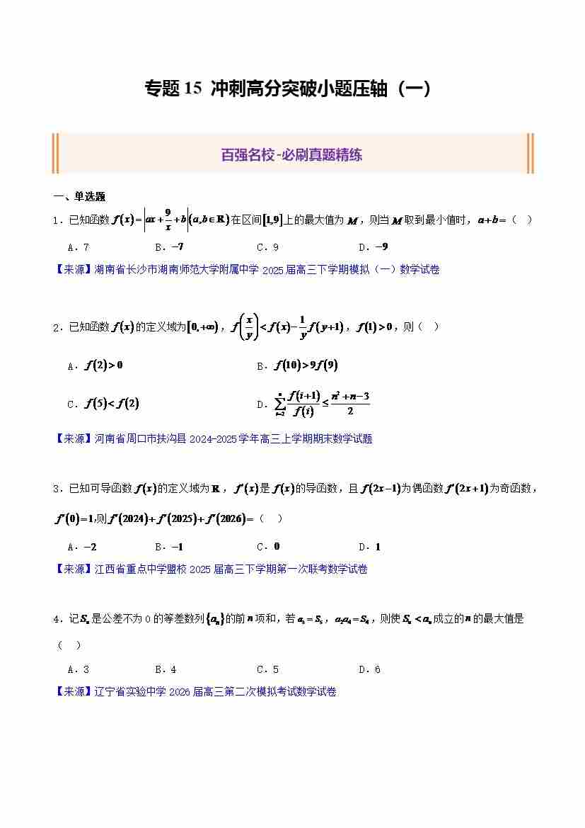 专题15 冲刺高分突破小题压轴(一)(精选50题)(学生版)