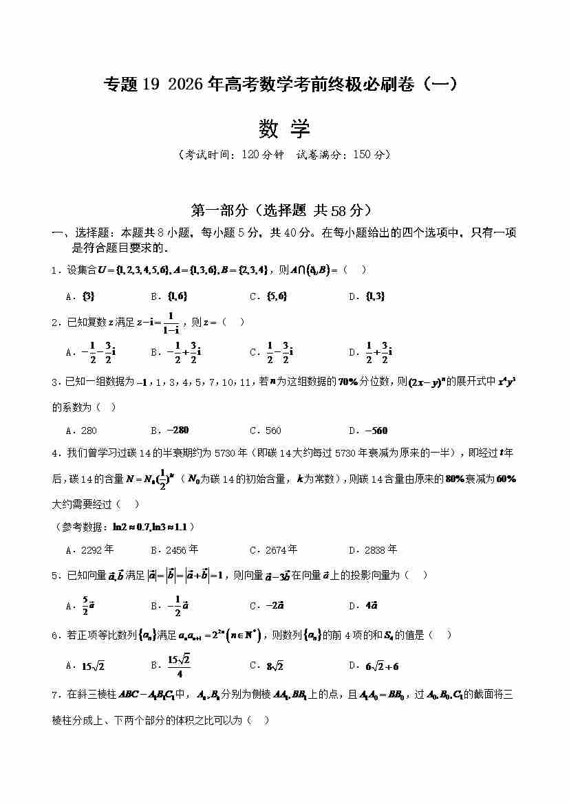 专题19 2026年高考数学考前终极必刷卷(一)(学生版)
