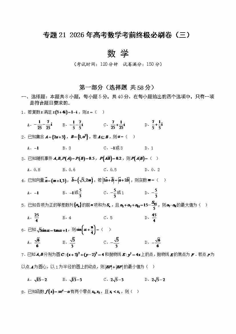 专题21 2026年高考数学考前终极必刷卷(三)(学生版)