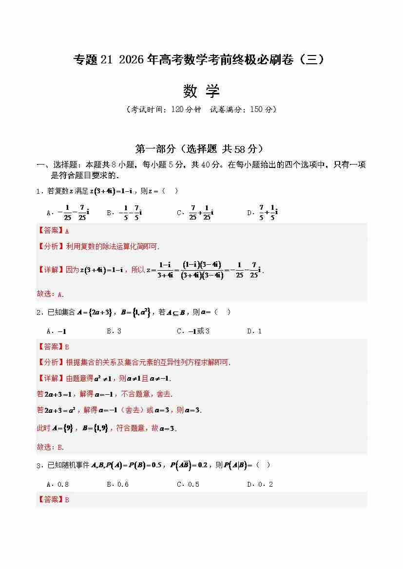 专题21 2026年高考数学考前终极必刷卷(三)(教师版)