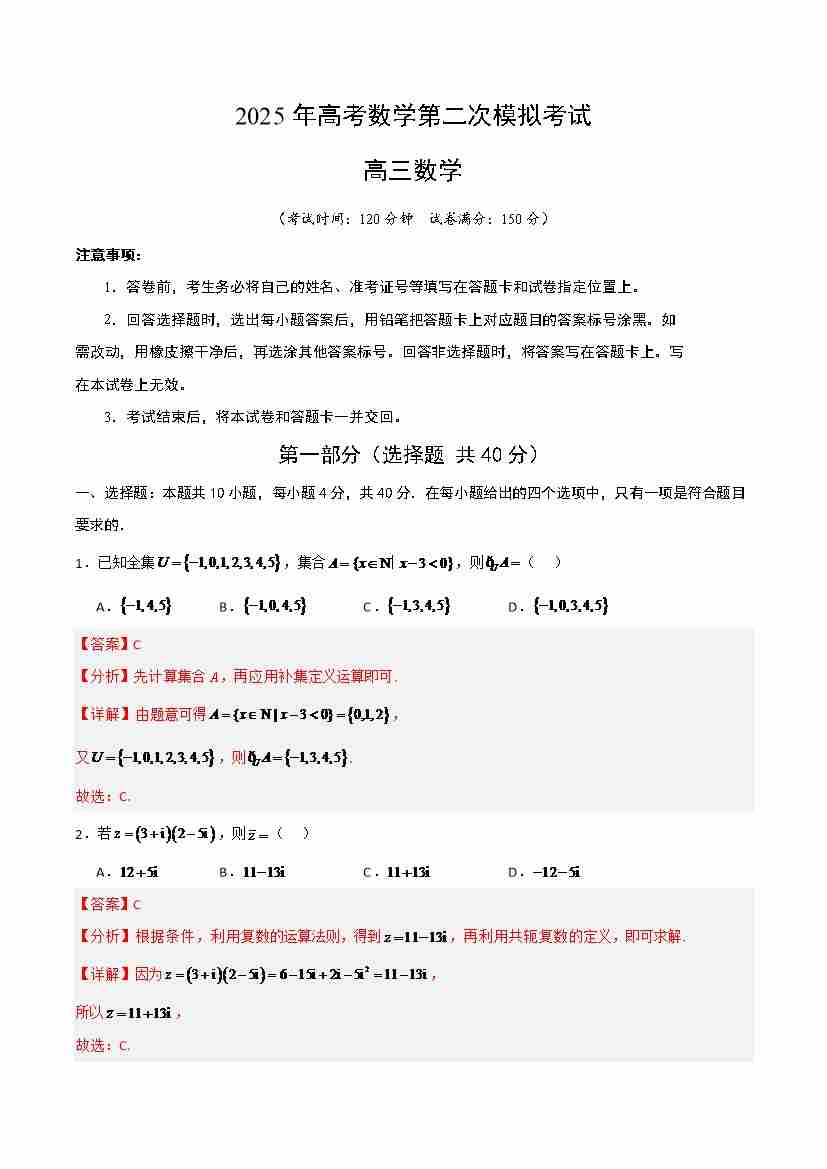 数学北京卷二模(全解全析)