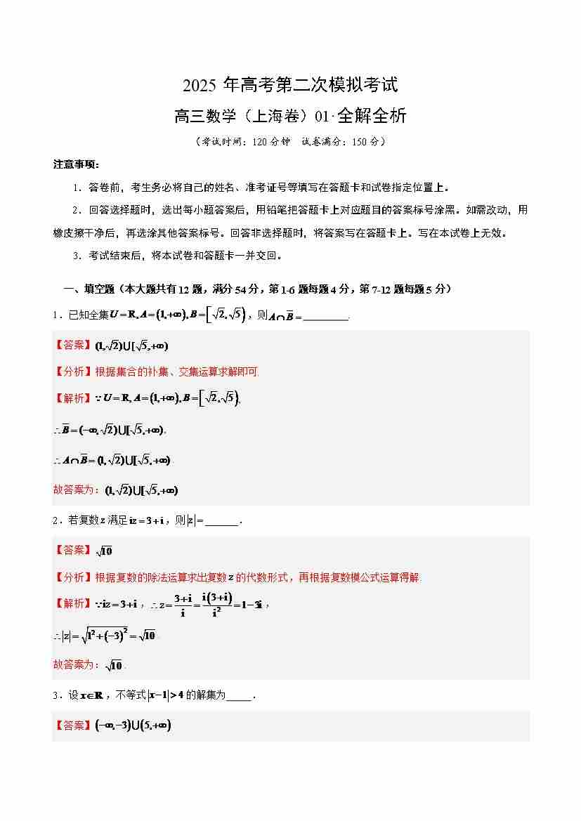 数学(上海卷01)(全解全析)