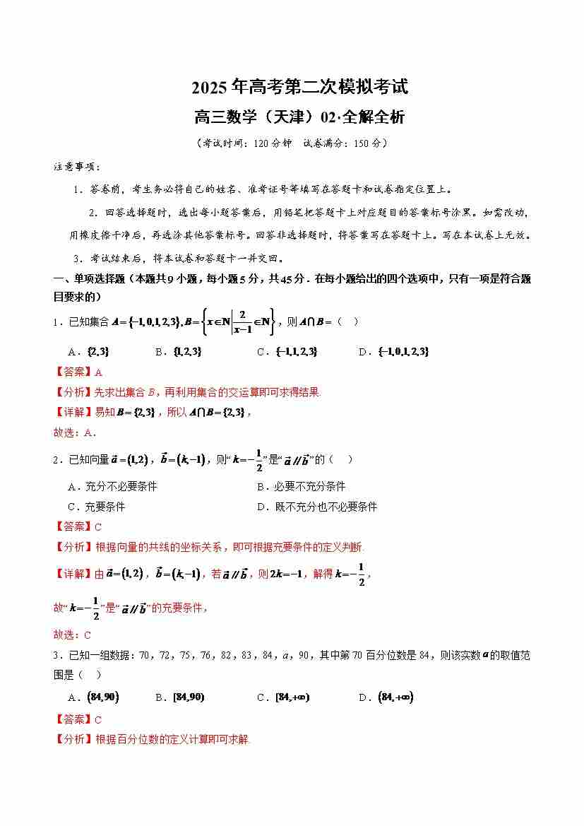 数学(天津卷02)(全解全析)