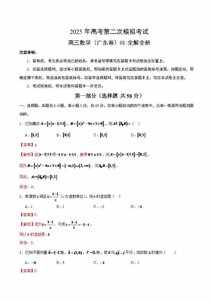 数学(广东卷01)(全解全析)