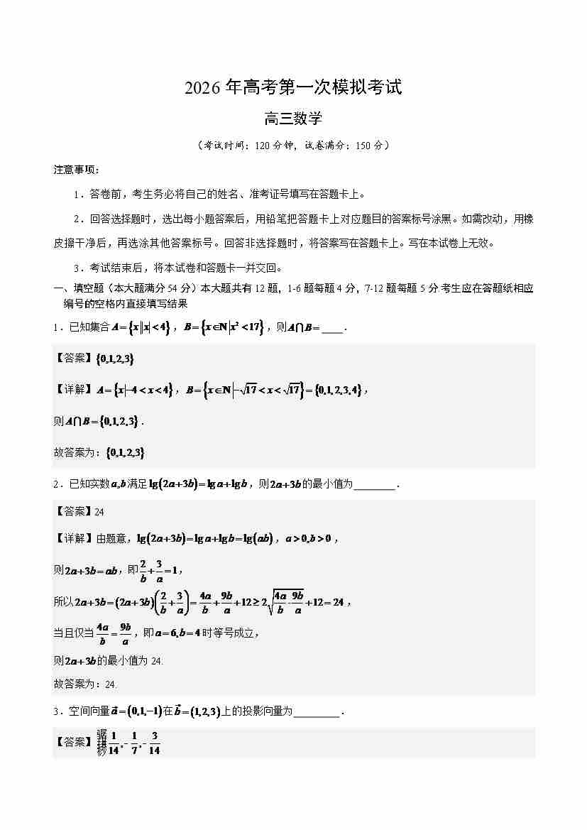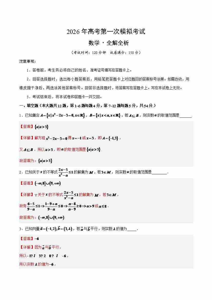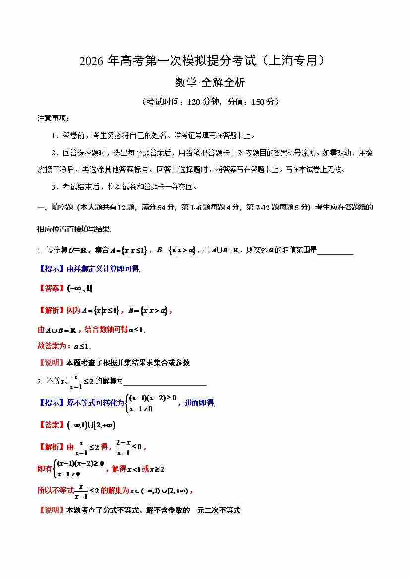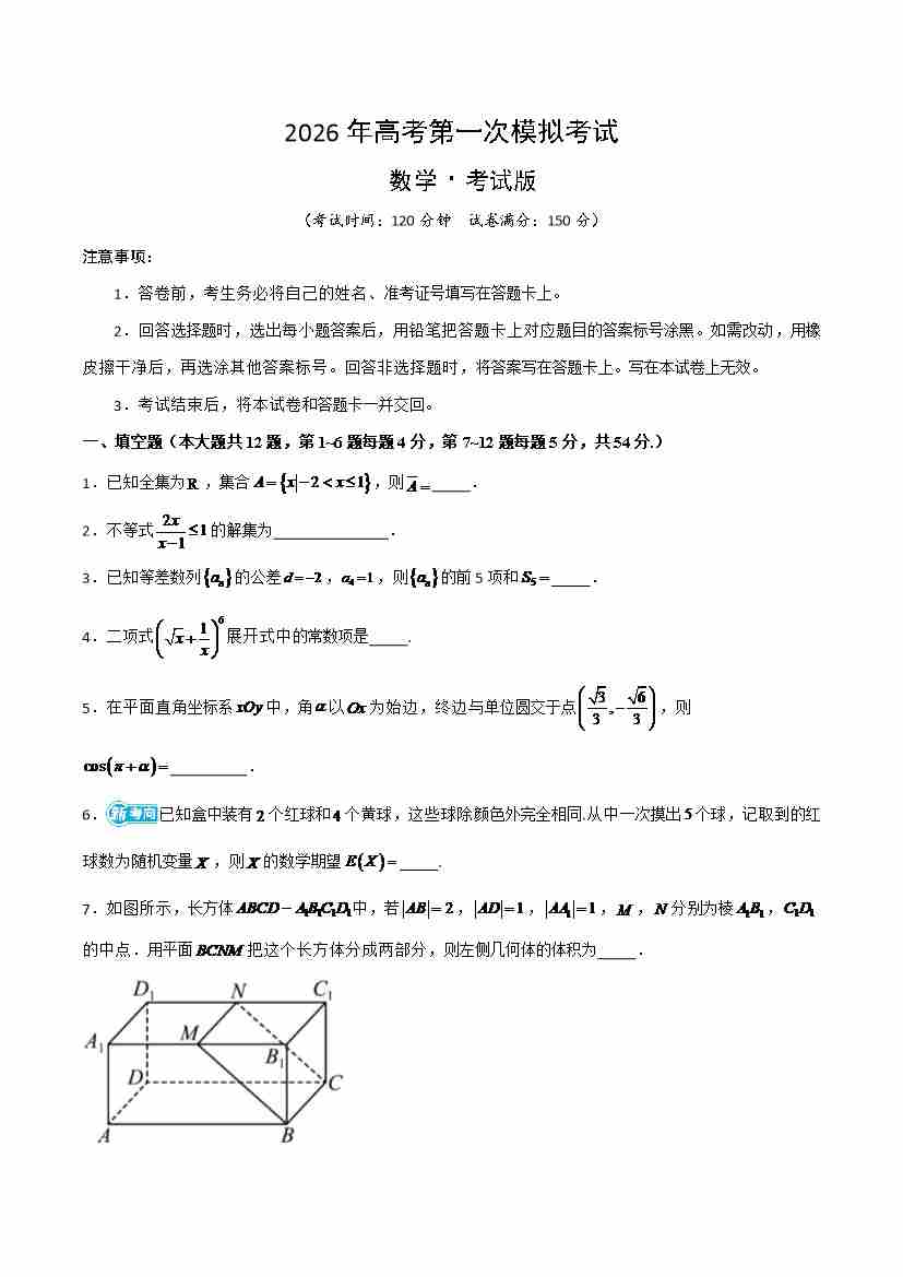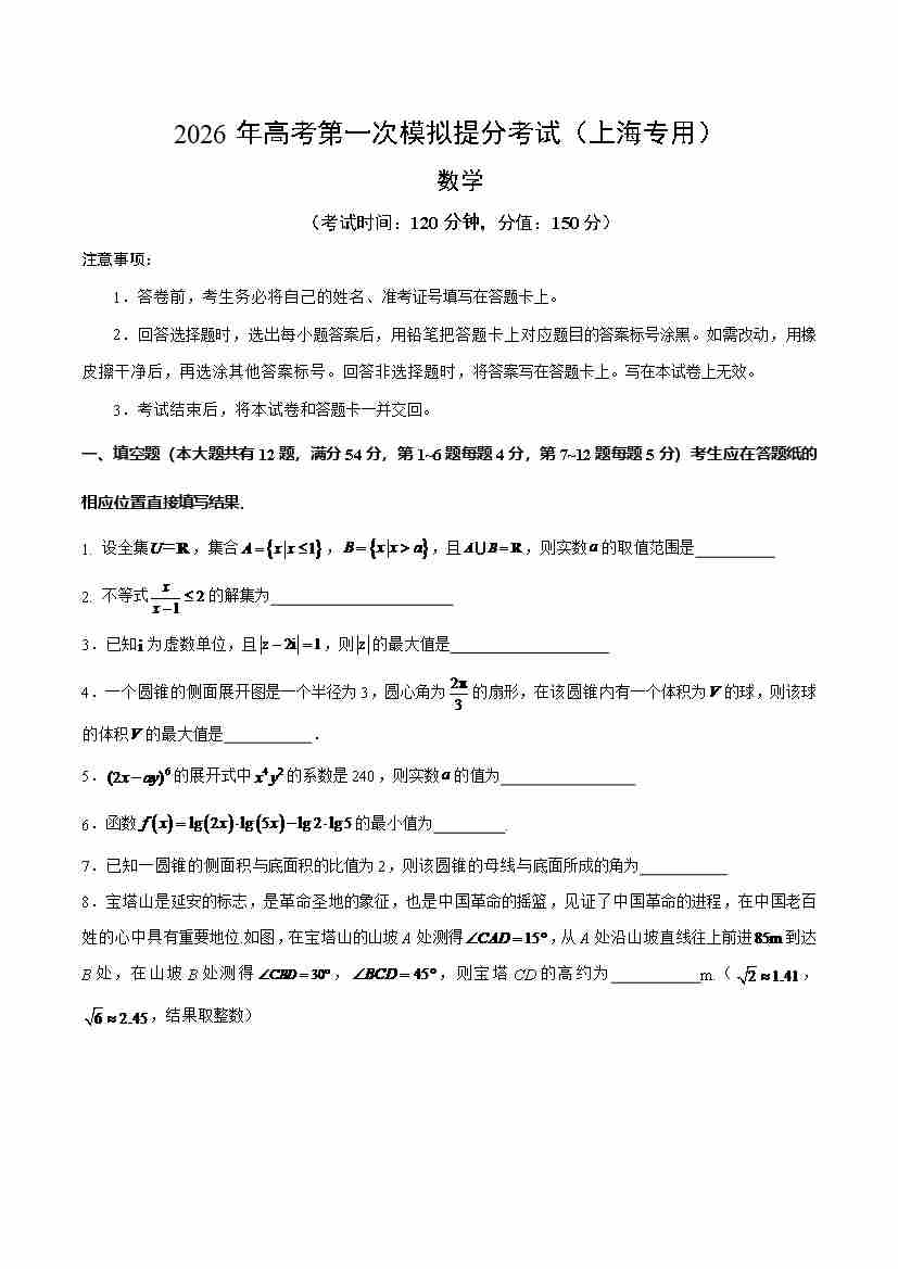数学一模突破卷01(上海卷)(考试版A4)