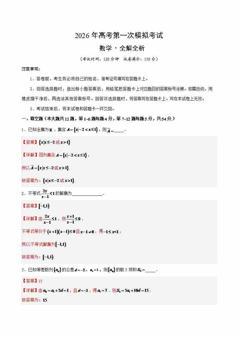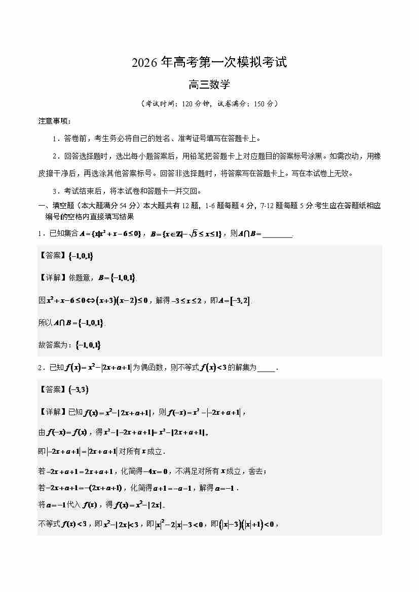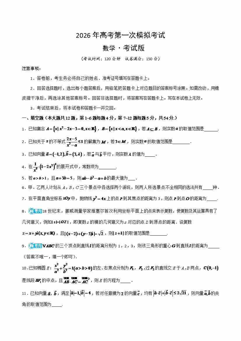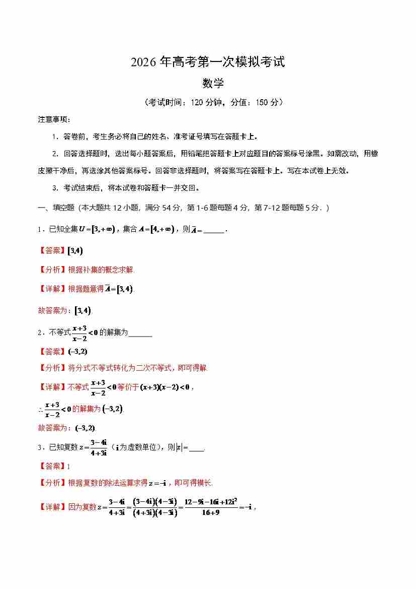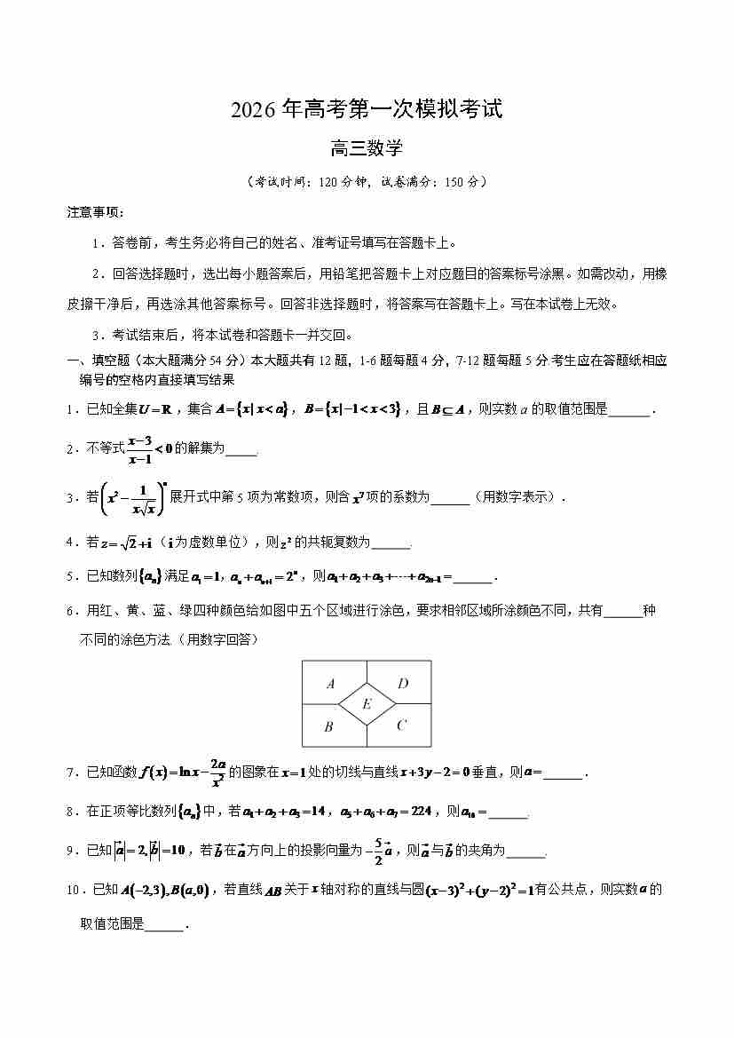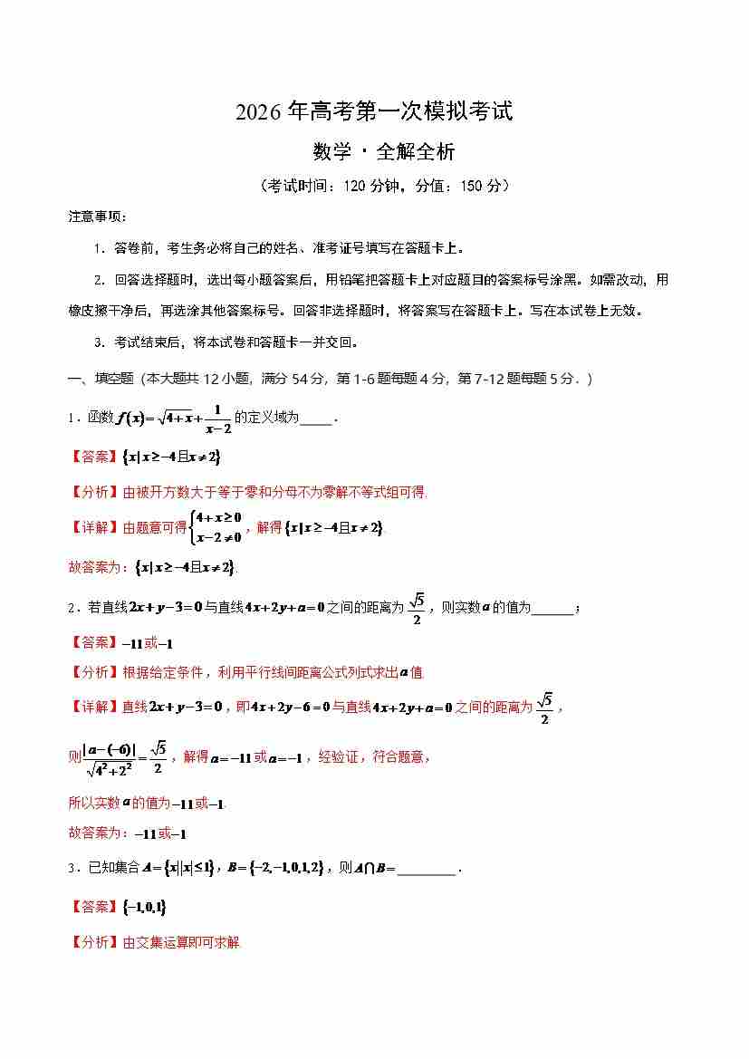 数学一模突破卷01(上海卷)(考试版A4)