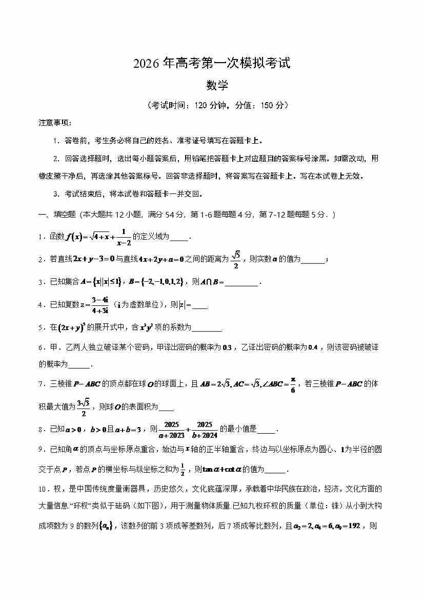 数学一模提分卷04(上海专用)(考试版)