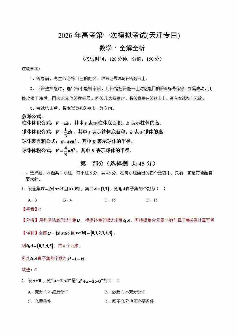 高考第一次模拟试题满分突破卷05(天津专用)(全解全析)