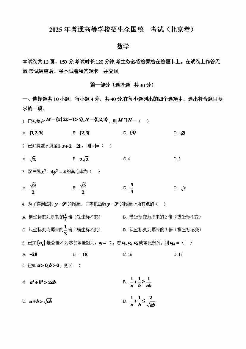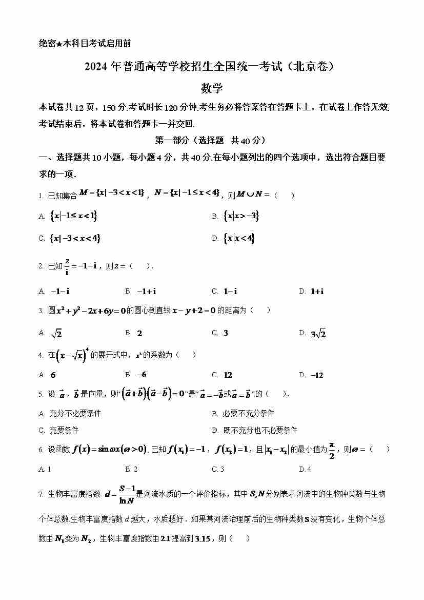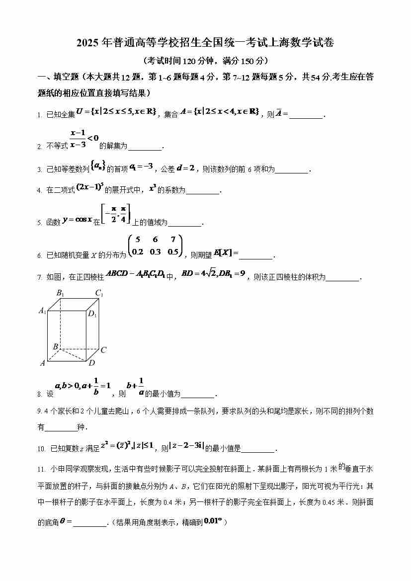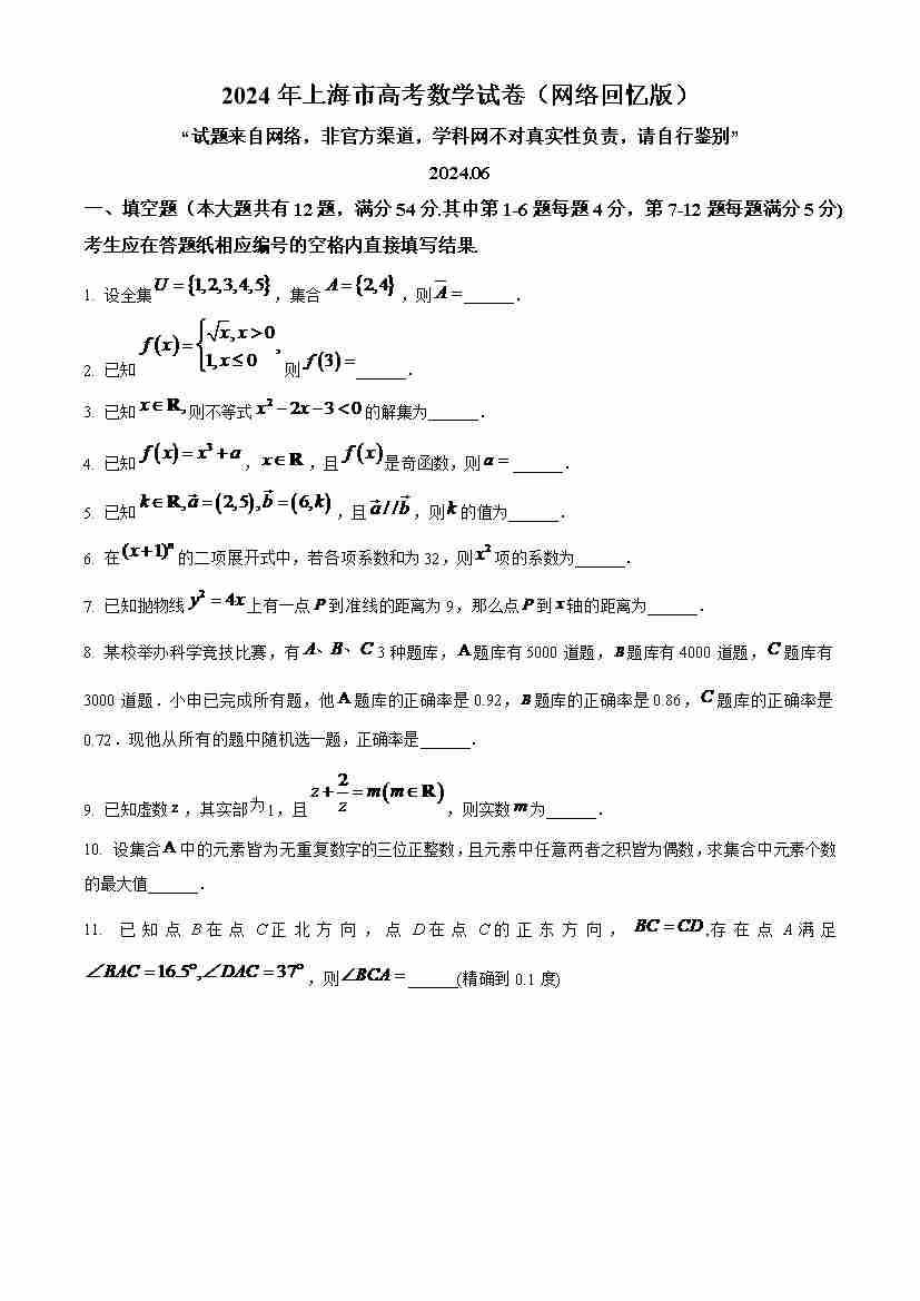 精品解析:2024年上海夏季高考数学真题(网络回忆版)(原卷版)