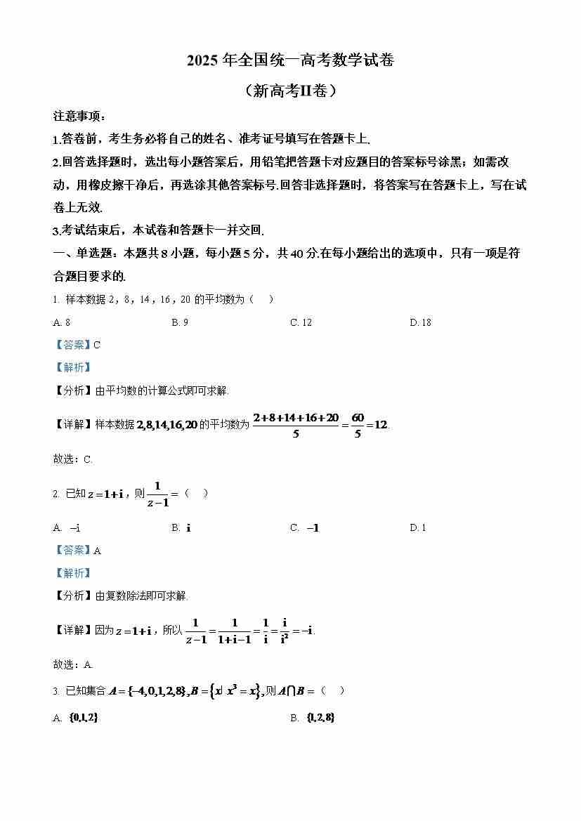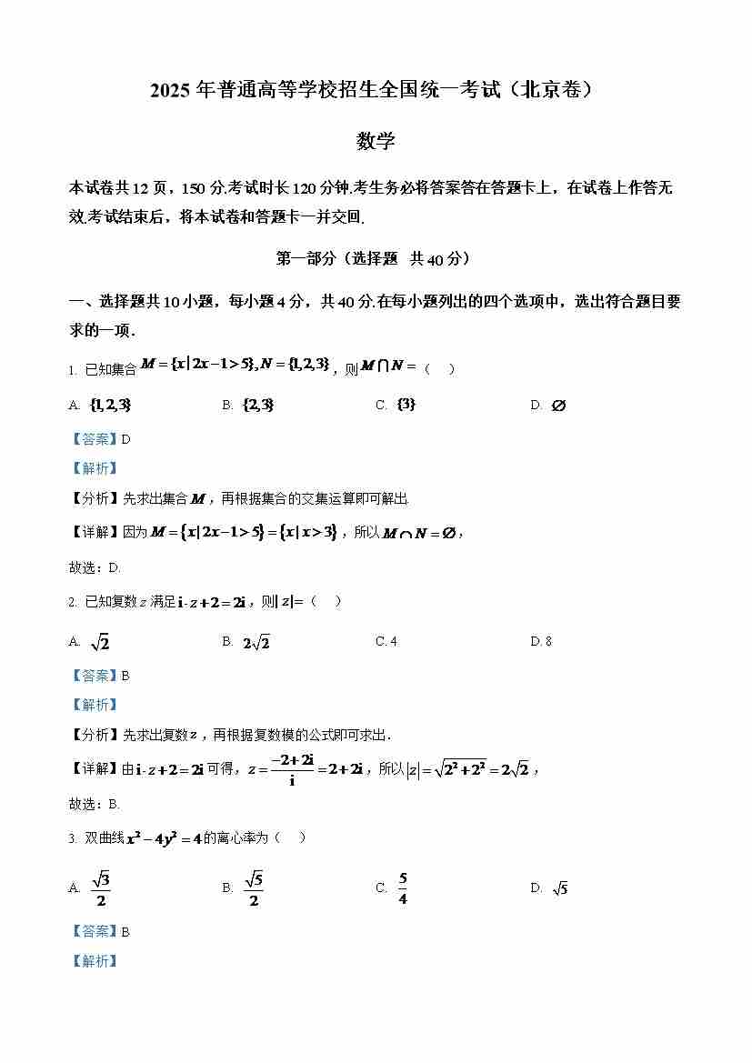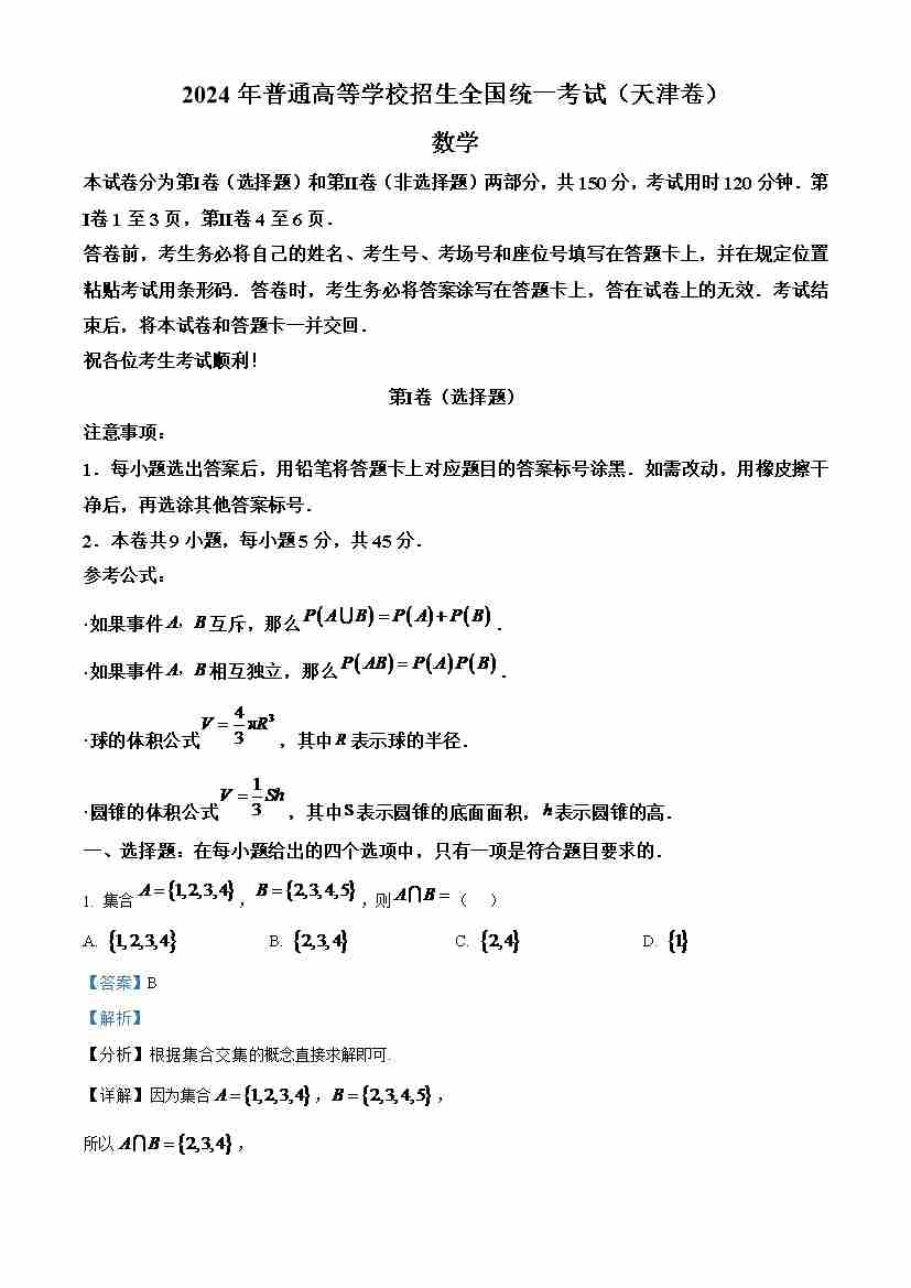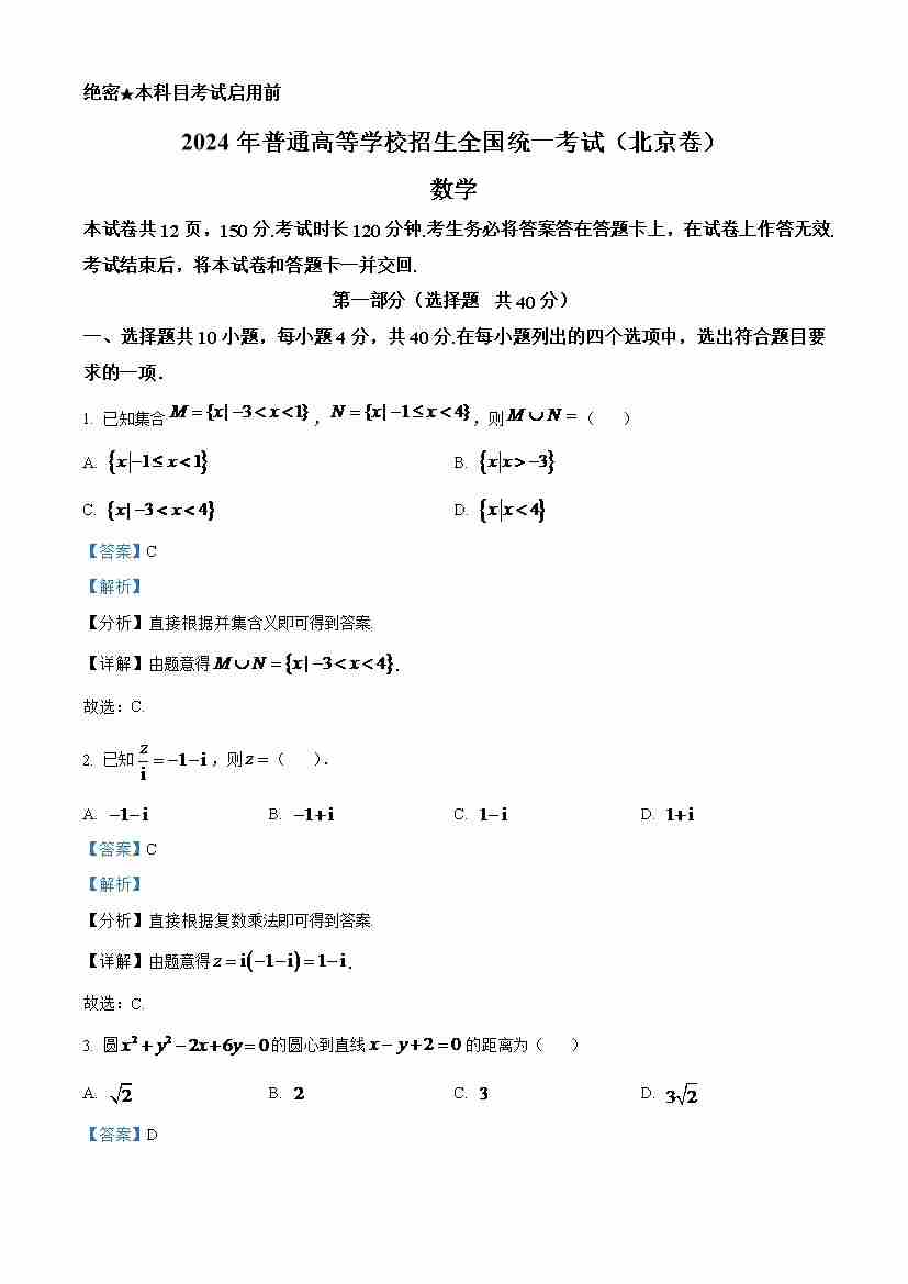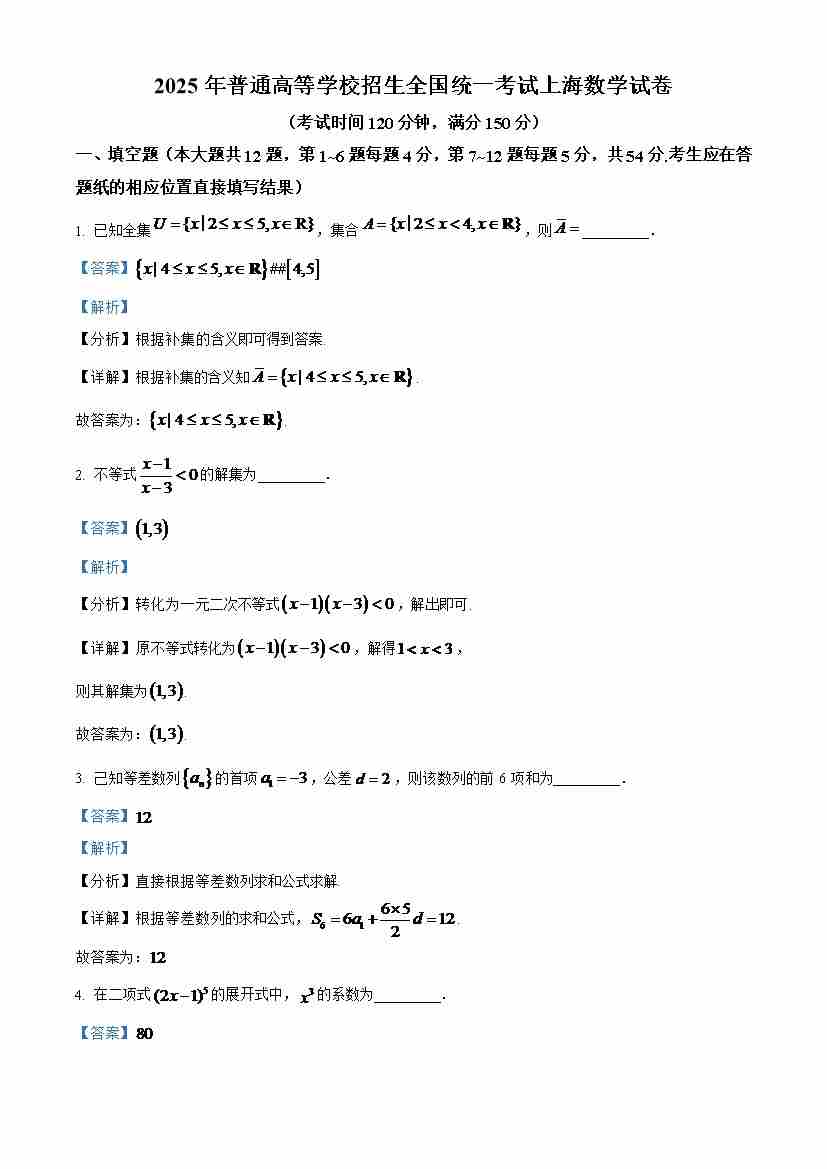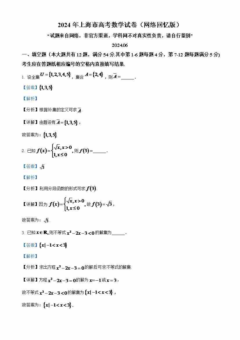 精品解析:2024年上海夏季高考数学真题(网络回忆版)(解析版)