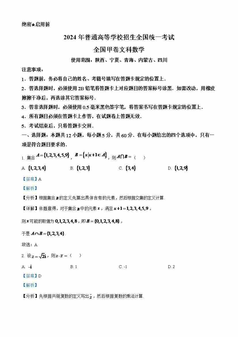 精品解析:2024年高考全国甲卷数学(文)真题(解析版)