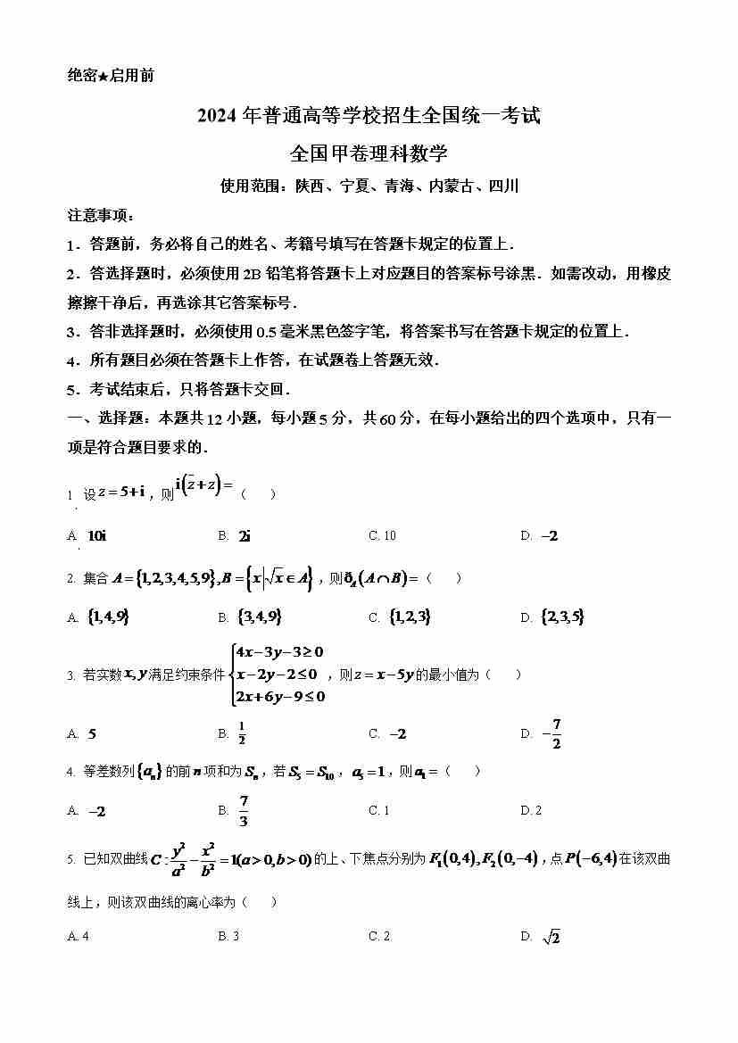 精品解析:2024年高考全国甲卷数学(理)真题(原卷版)