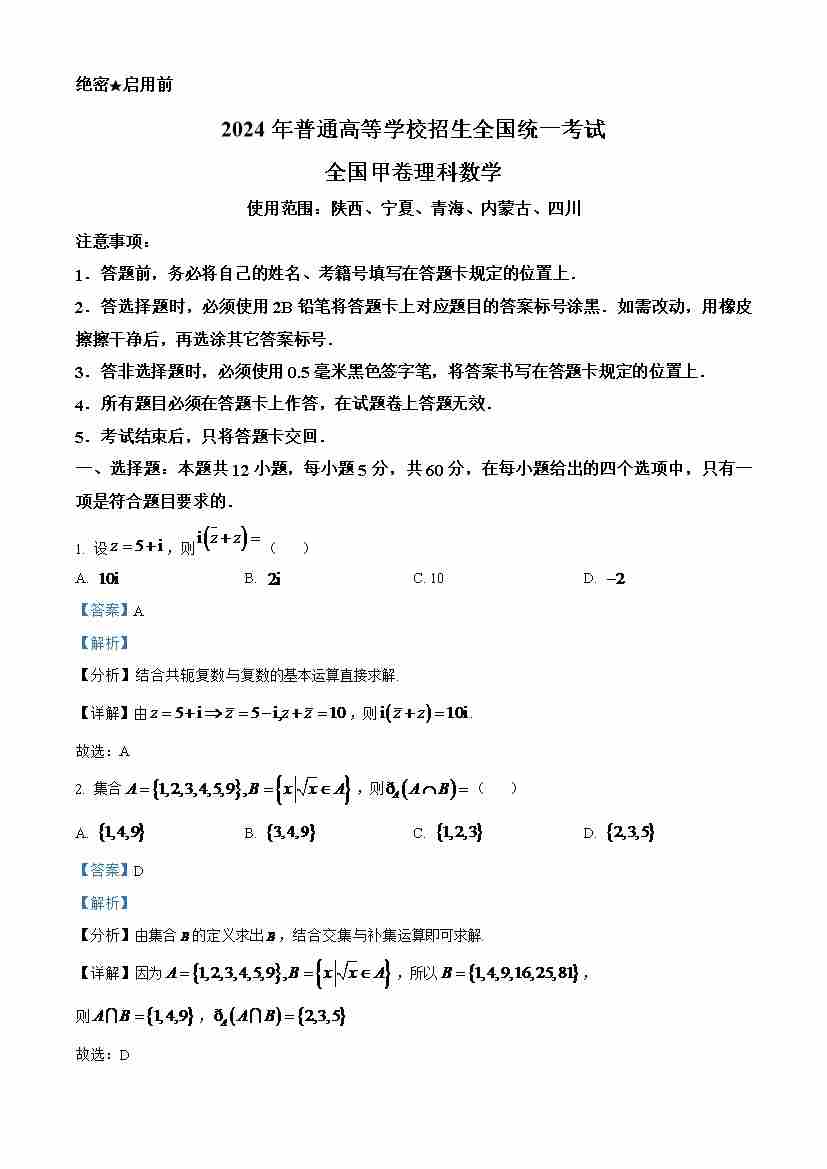 精品解析:2024年高考全国甲卷数学(理)真题(解析版)