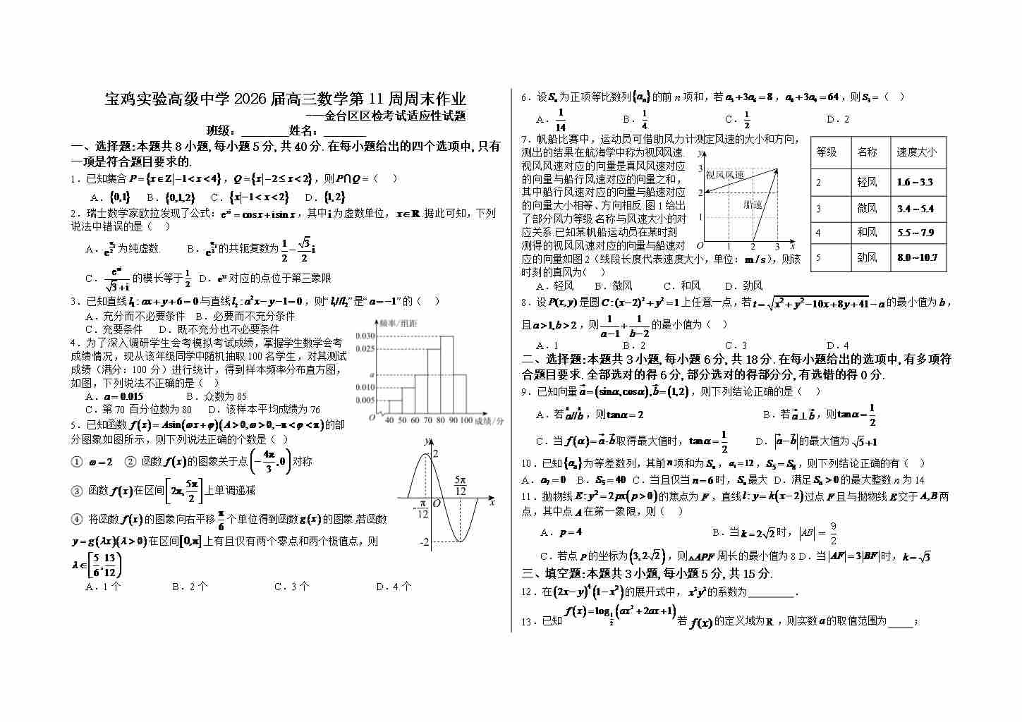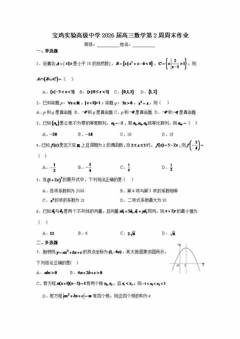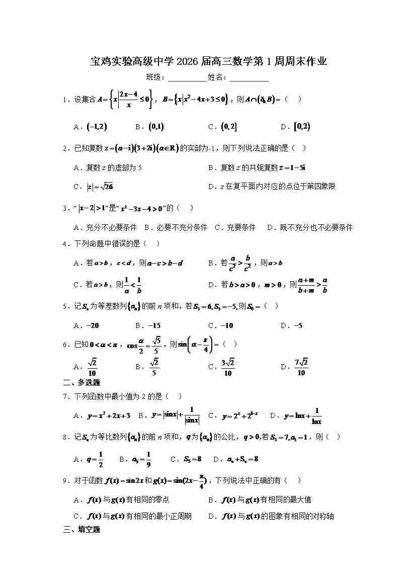 宝鸡实验高级中学2026届高三数学第2周周末作业(学生版)