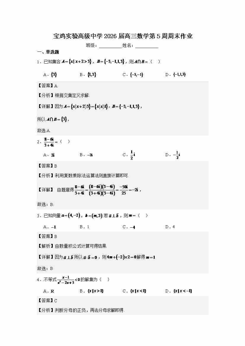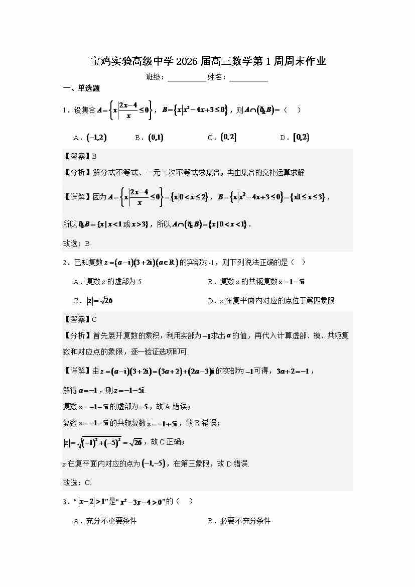宝鸡实验高级中学2026届高三数学第1周周末作业(教师版)